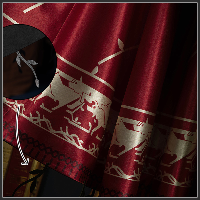 ポリエステルで製作しています。赤と黒の鮮やかな色合いで、金の柄が華やかさを添えています。