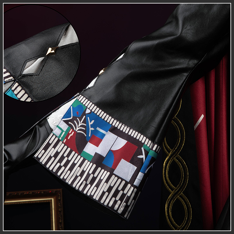 合皮で製作しています。袖口にユニークなカラーパターンが特徴です。モダンで個性的なファッションに最適です。