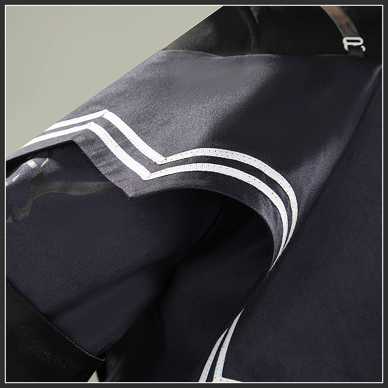 ポリエステルギャバで製作しています。セーラー風の肩が大きく折り返され、調整可能なストラップを備えたデザインで、白いラインがエレガントにアクセントを添えています。▼インナー