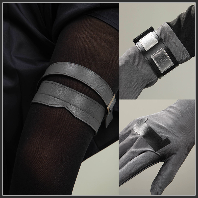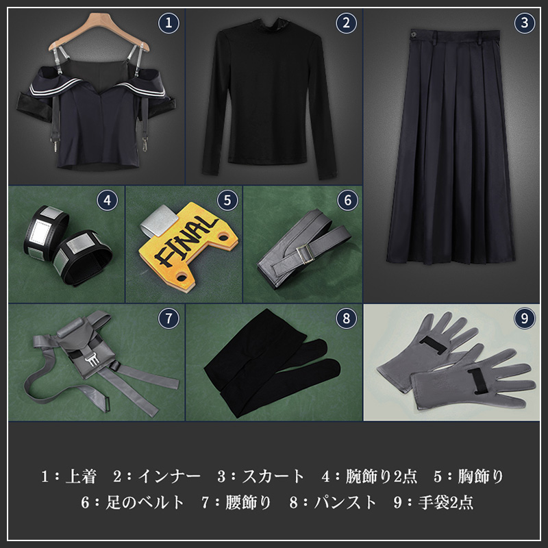 上着、インナー、スカート、飾り物(胸飾り、手袋2点、腕飾り2点、腰飾り、パンスト、足のベルト)