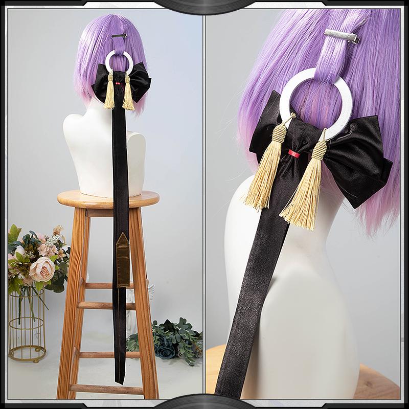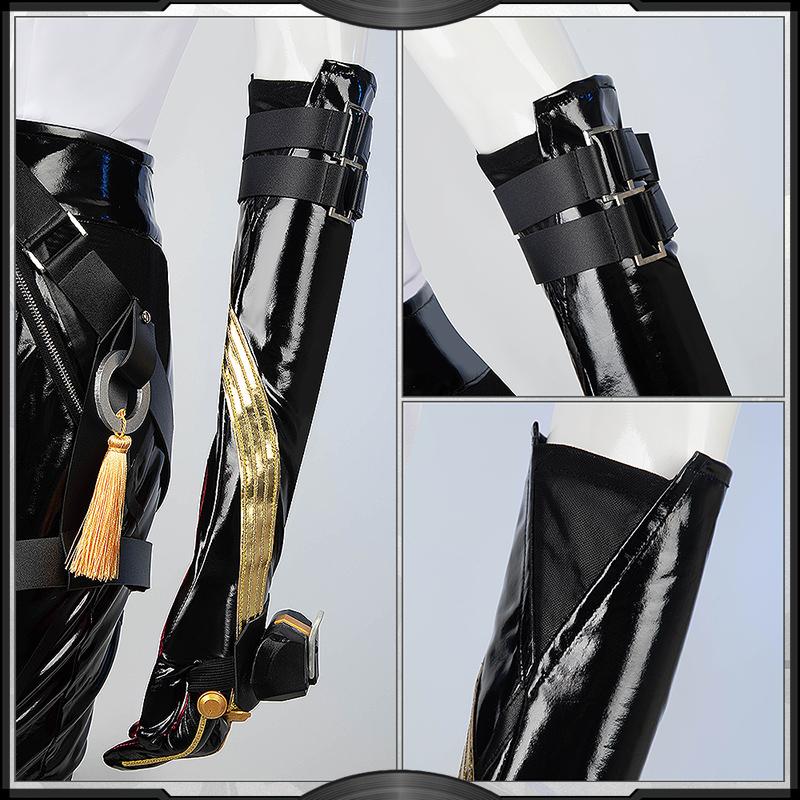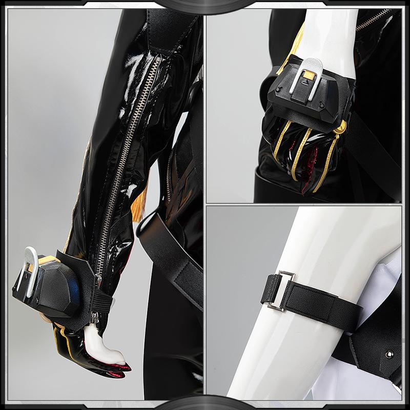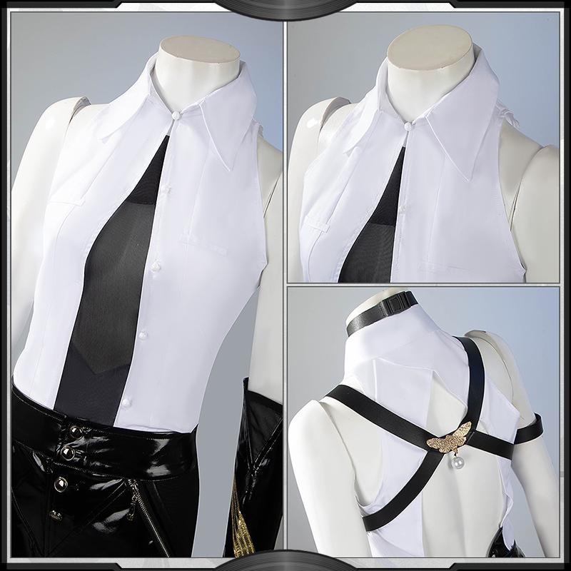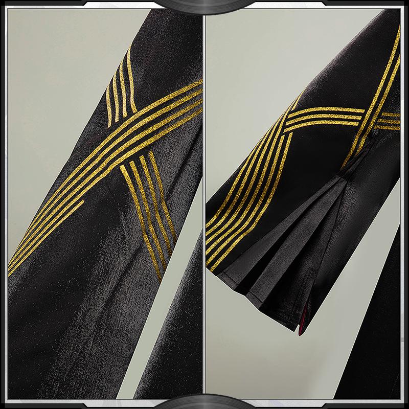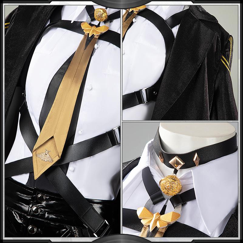 光沢布で製作しています。黒を基調として、両袖に金粉ホットスタンプ加工で精巧な柄を施しています。背中がスリットカットされたデザインです。ネクタイに飾られた蝶の飾りパーツは3Dプリントで原作に忠実した模様が再現するよう心掛けています。