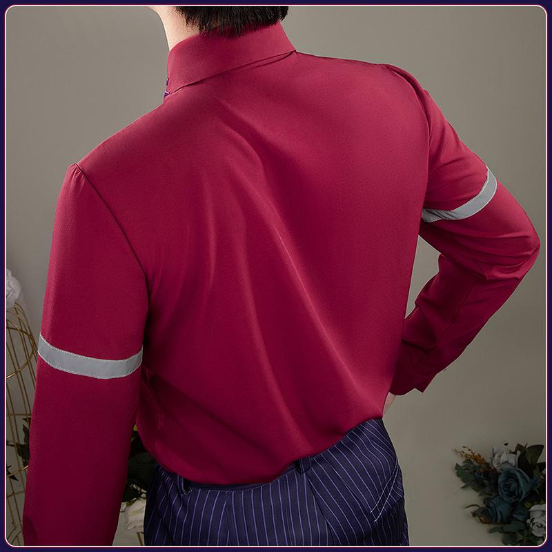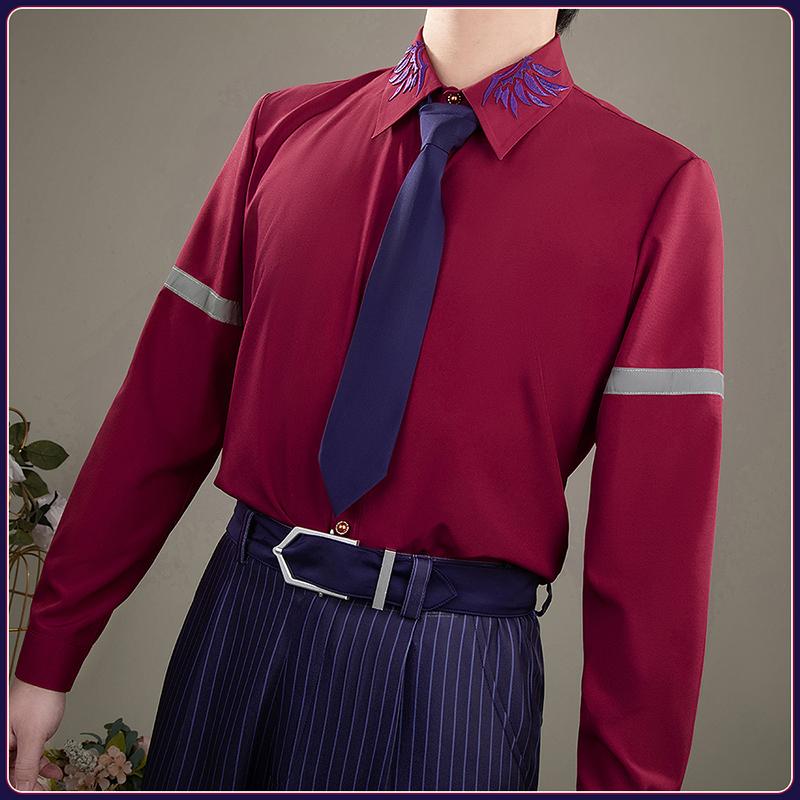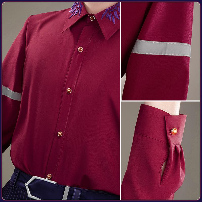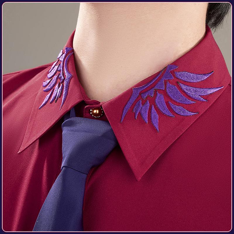 シャツ生地で製作しています。シンプルな赤いシャツで、いい素材を使ったので、着心地が良いです。襟に特徴な翼の刺繡が施されて、忠実に再現することが求められました。