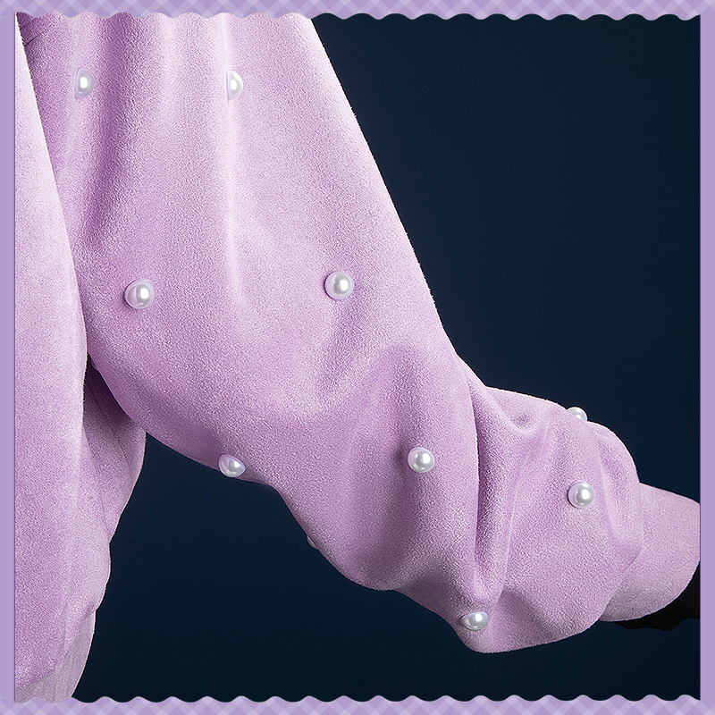 スエード生地で製作しています。シンプルなデザインに、パールの装飾が華やかさを添えています。