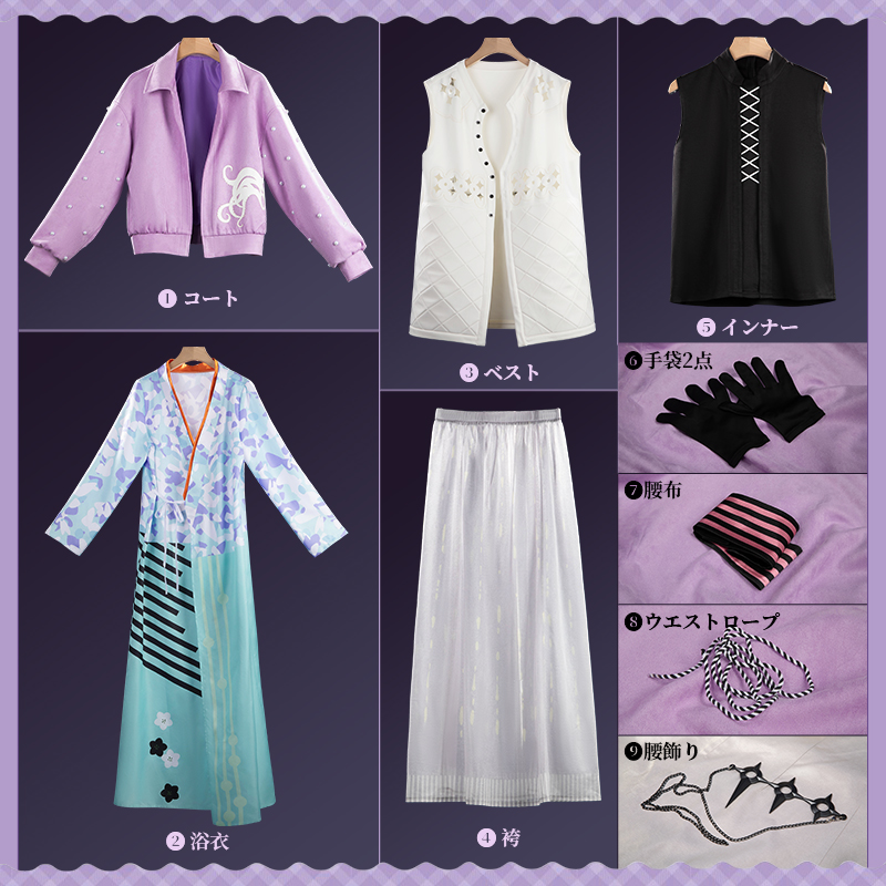 コート、ベスト、インナー、浴衣、袴、飾り物(手袋2点、ウエストロープ、腰布、腰飾り)