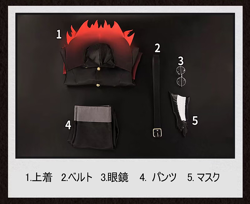 上着、パンツ、飾り物(眼鏡、マスク、ベルト)