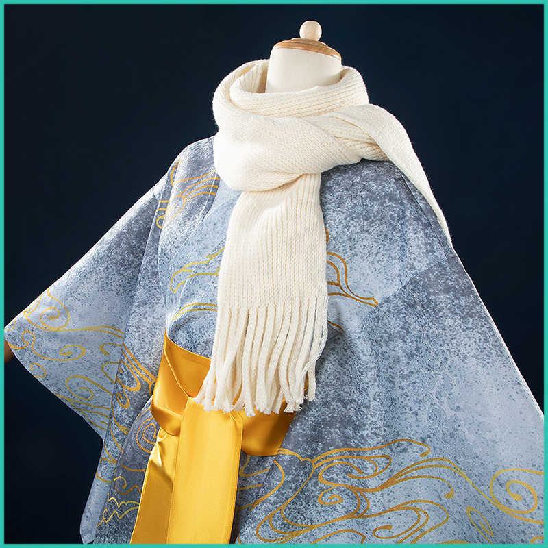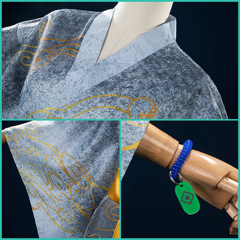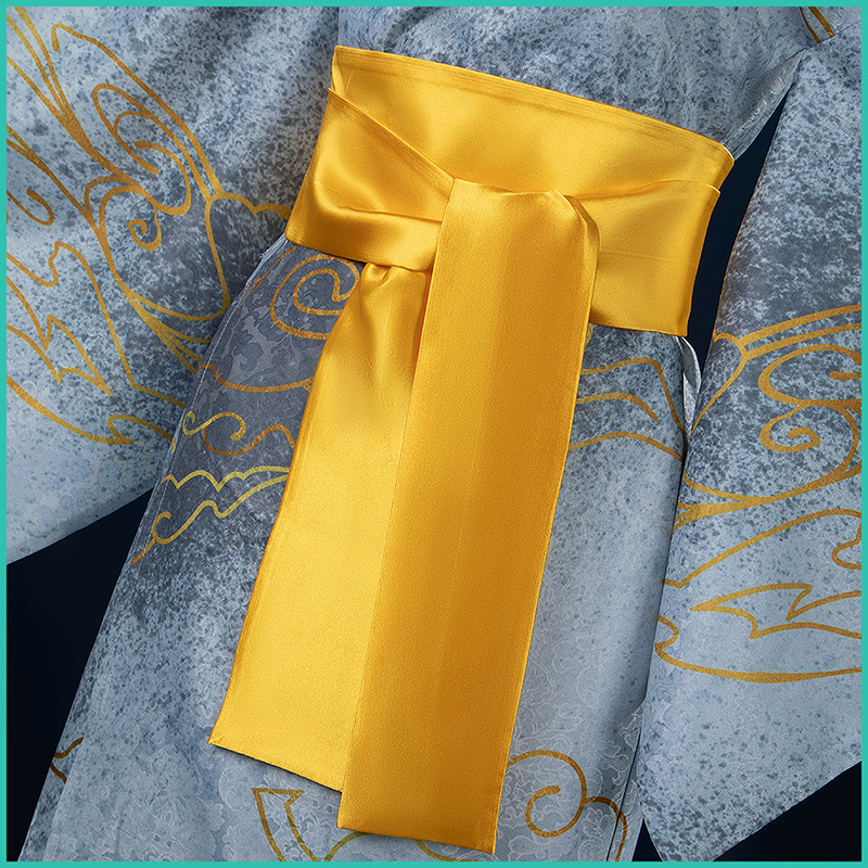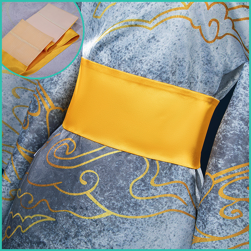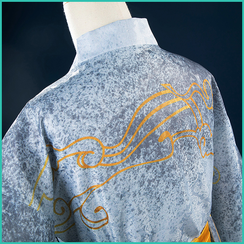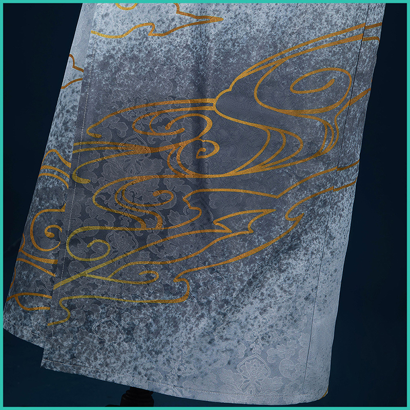 ジャガード生地で製作しています。淡い灰色の布地に金色の雲が舞うかのような美しさをたたえています。まるで月の光が照らす幻想的な風景のように、白い帯がその優美さを引き立て、着る者に静寂と高雅さを纏わせます。