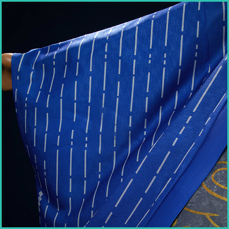 綿麻生地で製作しています。青地に白い縦縞模様があしらわれた美しいデザインで、着心地が良く、軽やかな感覚を楽しめる一方で、伝統的なエレガンスを漂わせます。