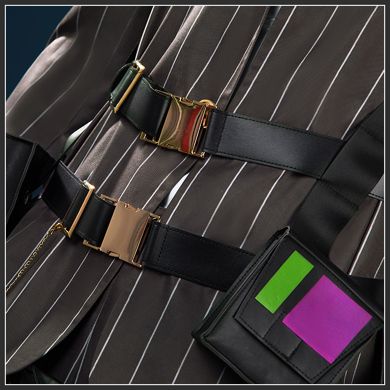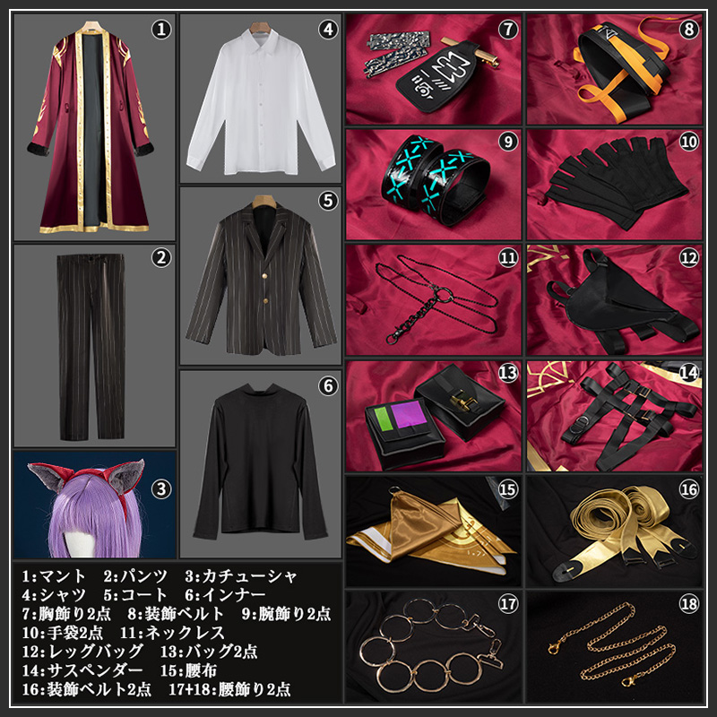 マント、上着、シャツ、インナー、パンツ、飾り物(カチューシャ、ネックレス、胸飾り、腕飾り2点、腰飾り、装飾ベルト2点、バッグ2点、ベルト、手袋2点、レッグカバー)