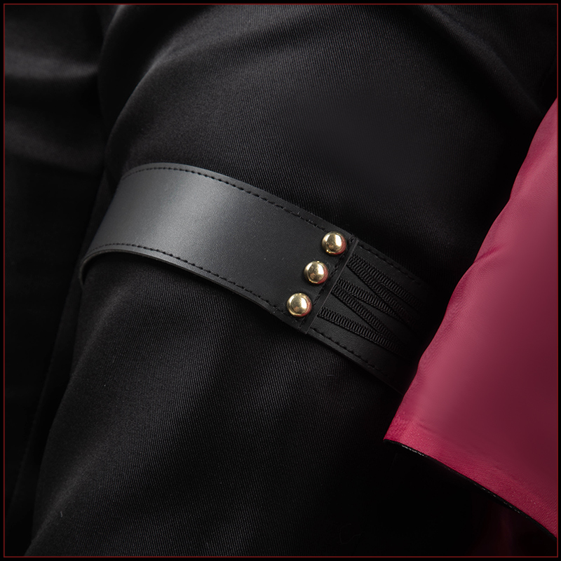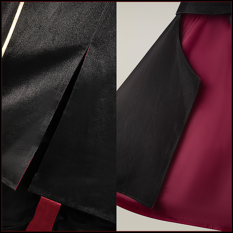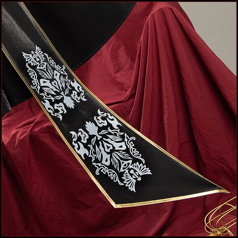 光沢布で製作しています。赤い裏地が深みと華やかさを添え、優雅さと存在感を漂わせ、金色の装飾が施されて威厳と気品を際立たせる。