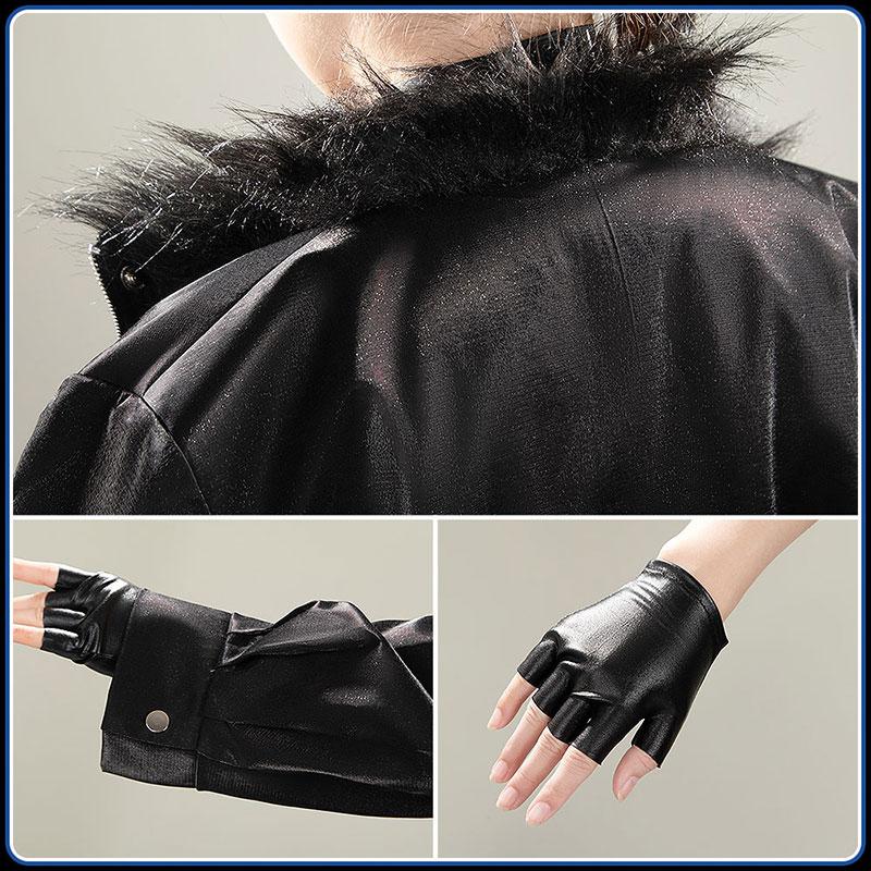 光沢布で製作しています。クールなパンクスタイルの特徴です、マルチポケットと金属ボタン、ジッパーのディテールが機能美とスタイルを両立し、袖口とブラックレザー指切り手袋との相性も絶妙。