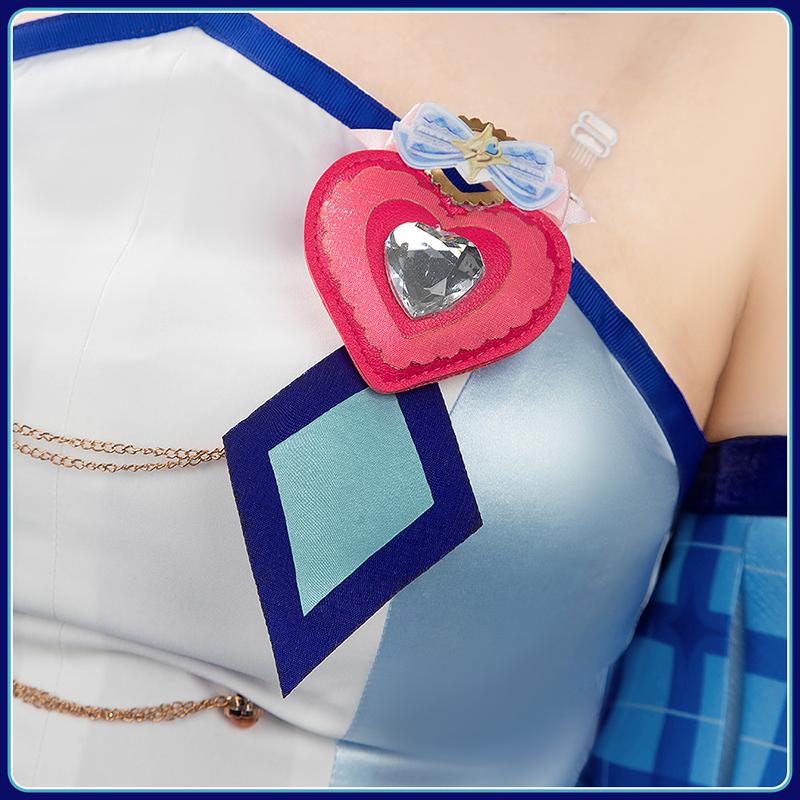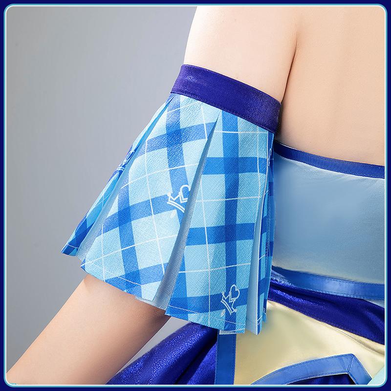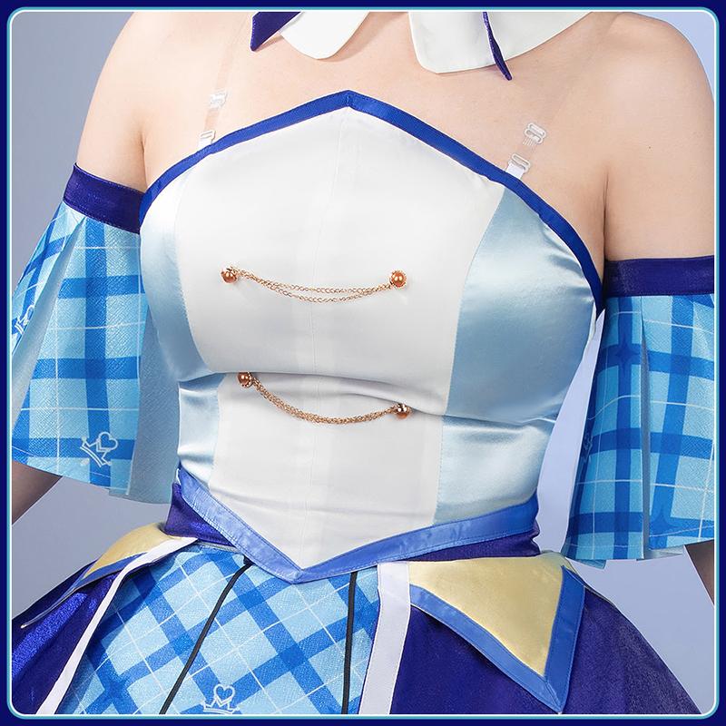 上着はサテンで製作しています。水色とホワイトのカラーブロックデザインしたストラップレスで、ウエストのシルエットを美しく際立たせています。付け襟はサテンで制作、真ん中に蝶結びが飾っており、ふんわりした付け袖と組み合わせて、可愛さ倍増!