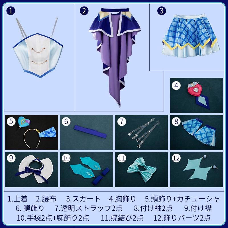上着、スカート、腰布、付け襟、付け袖2点、飾り物(手袋2点+腕飾り2点、胸飾り、頭飾り、カチューシャ、腿飾り、蝶結び2点、飾りパーツ2点)