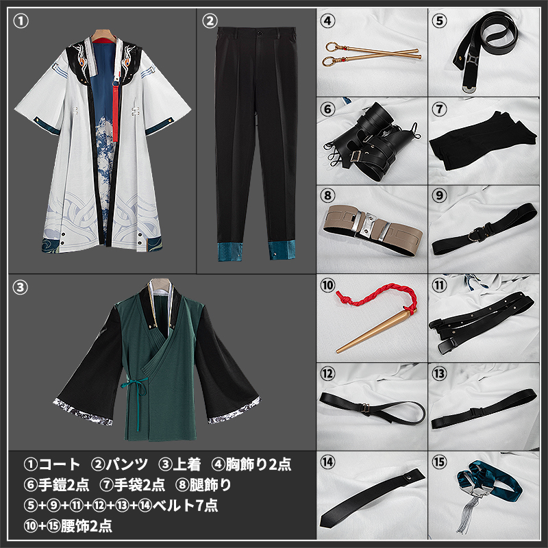コート、上着、パンツ、飾り物(手鎧、胸飾り2点、腰飾り、ベルト7点、手袋2点、腿飾り)