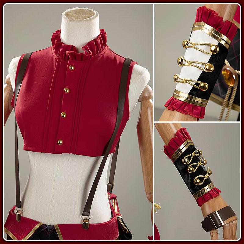 ポリエステルギャバで製作しています。黒と赤のチェック柄で、ゴールドの縁取りとブラウスが付いたショートパンツです、前面にはゴールドのロープチェーンが装飾され、背面には大きな赤いリボンがあります。側面には金フリンジのスカーフ、チェーンアクセサリーなど、ヴィンテージ風とゴシック風が融合した精緻なディテールが随所にみられます。