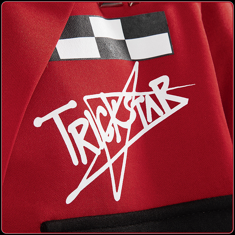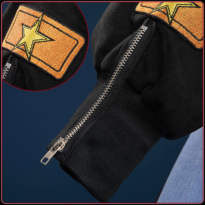 スエード生地とダンボールニット生地で製作しています。黒の落ち着きと赤の情熱がシックに調和したカジュアルなジャケットです。