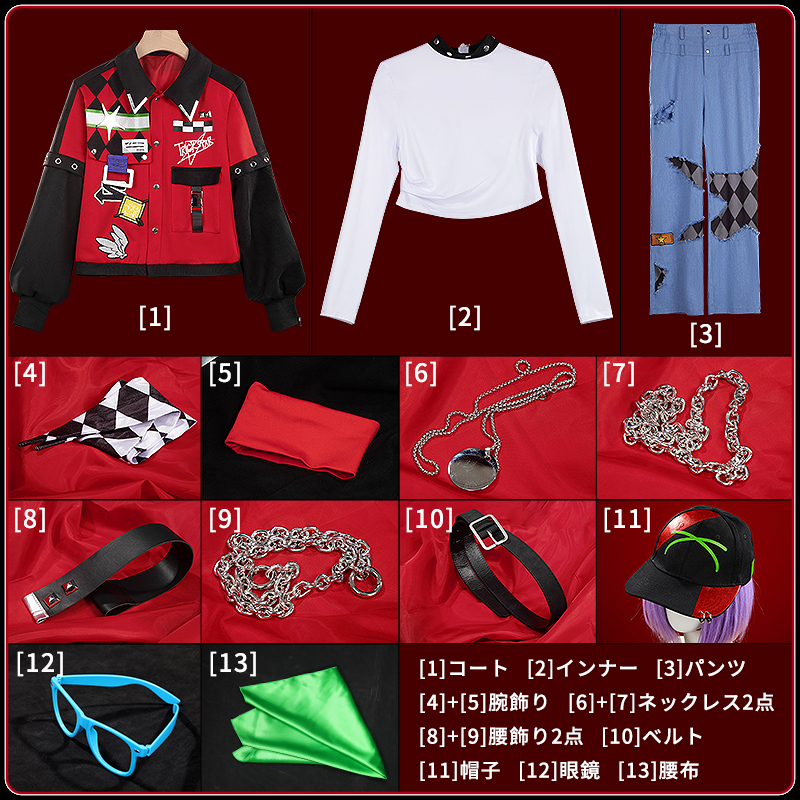 コート、インナー、パンツ、飾り物(帽子、腕飾り2点、ネックレス2点、腰飾り2点、ベルト、眼鏡)