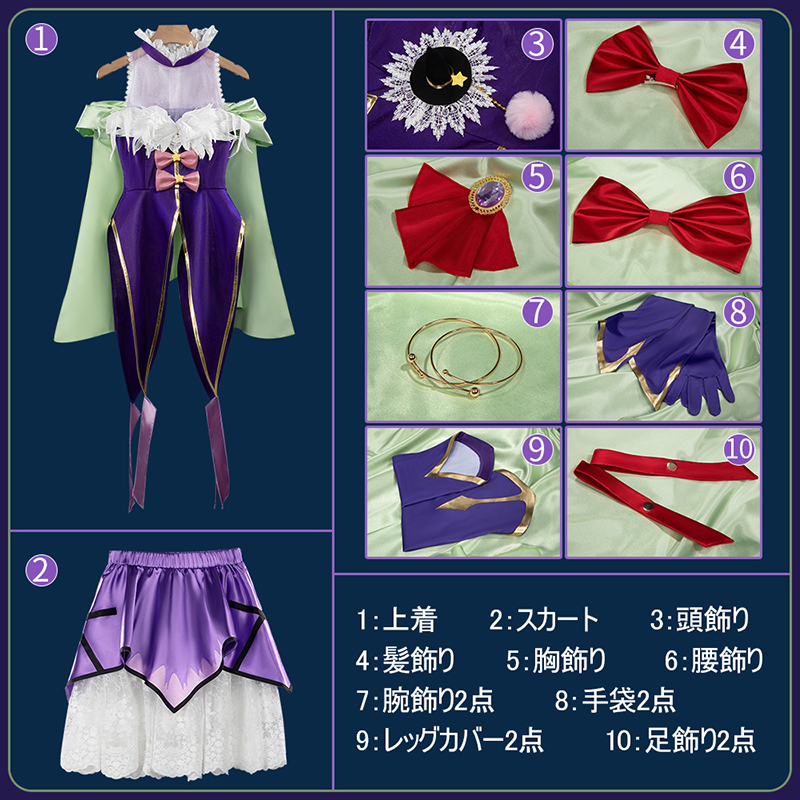 上着、スカート、飾り物(頭飾り、髪飾り、胸飾り、腰飾り、腕飾り2点、手袋2点、レッグカバー2点、足飾り2点)