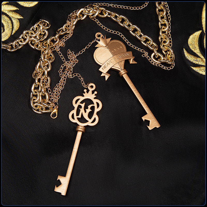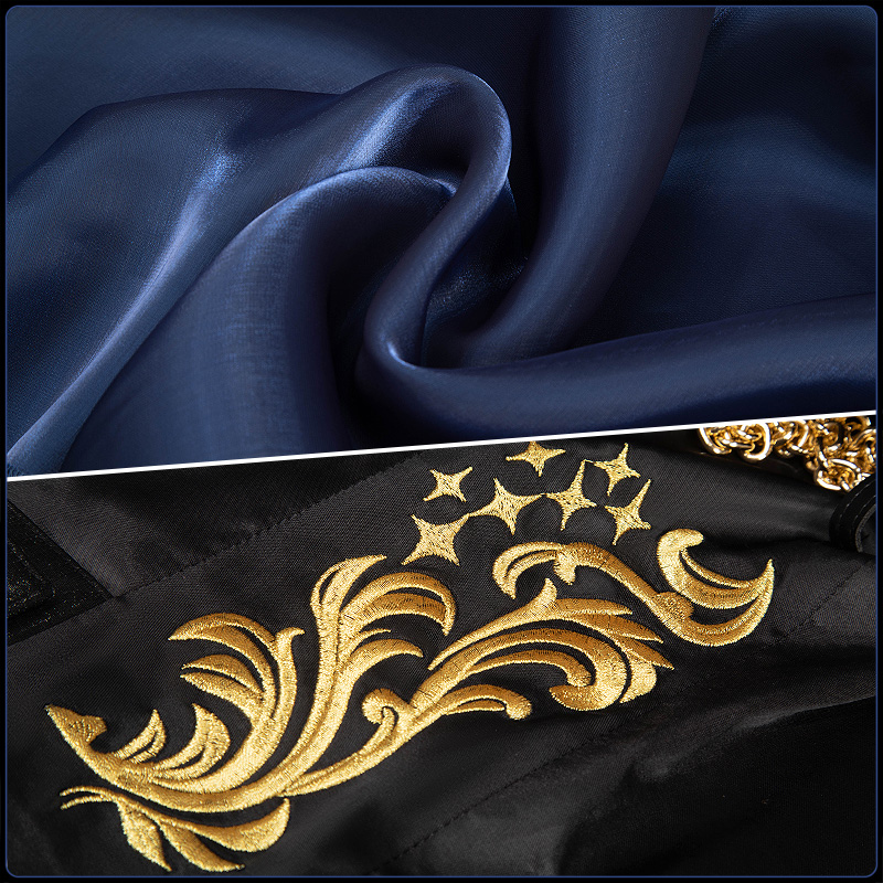 ダッチェスで製作しています。黒を基調としたデザインに、金色の刺繍が目を引くアクセントとなり、襟と袖に鏤められた煌びやかな宝石が個性的な魅力をさりげなく引き出している。