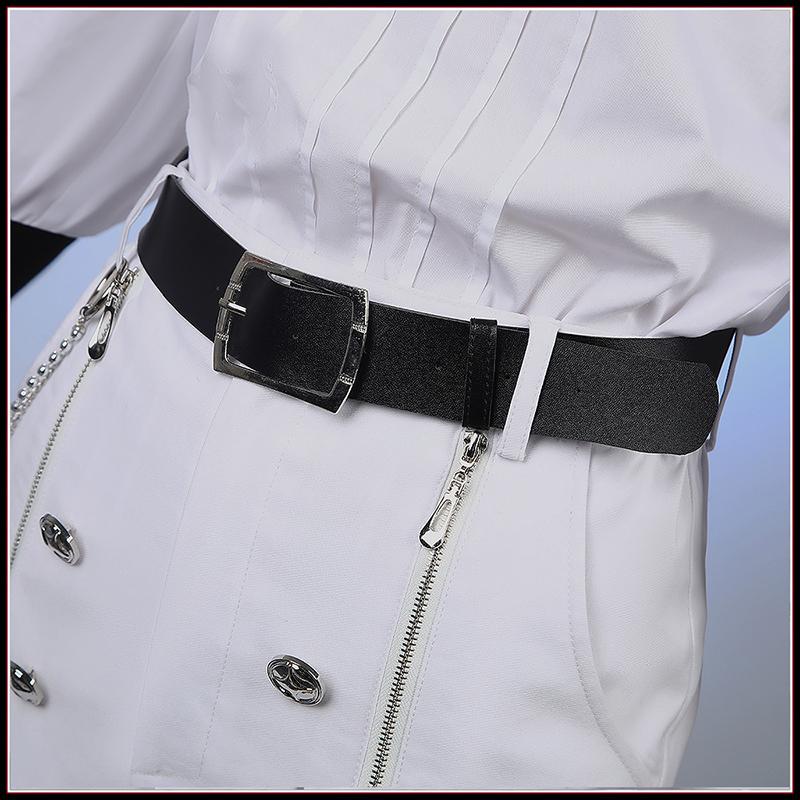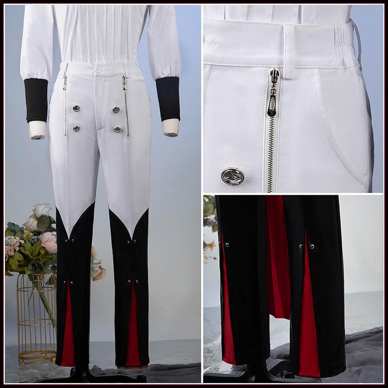 主にストレッチデニム+合皮で製作しています。上は白い、下は黒いのパッチワークデザインで、超個性的です。フロントにファスナーと金属ボタンが装飾されていて、細部までしっかり作られて忠実に再現することが求められました。