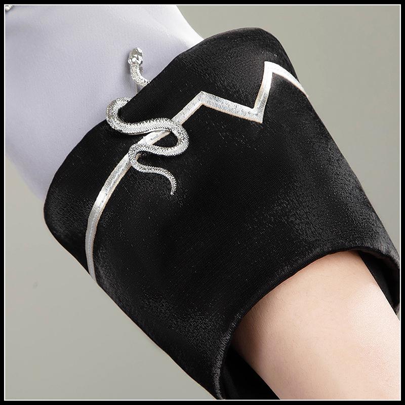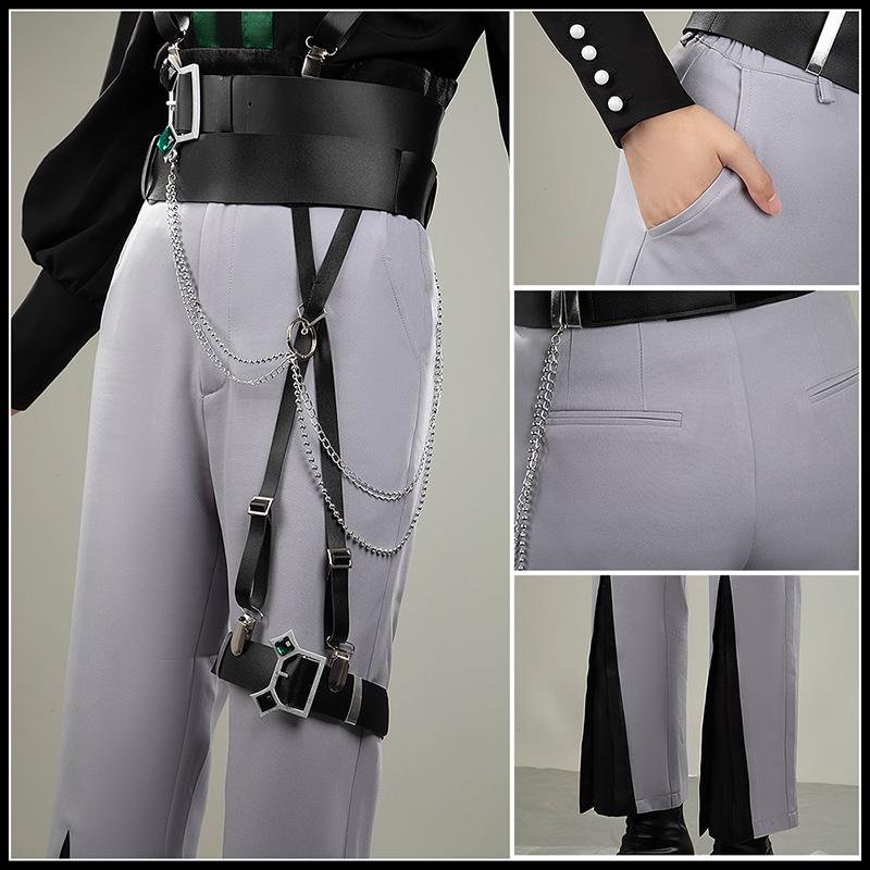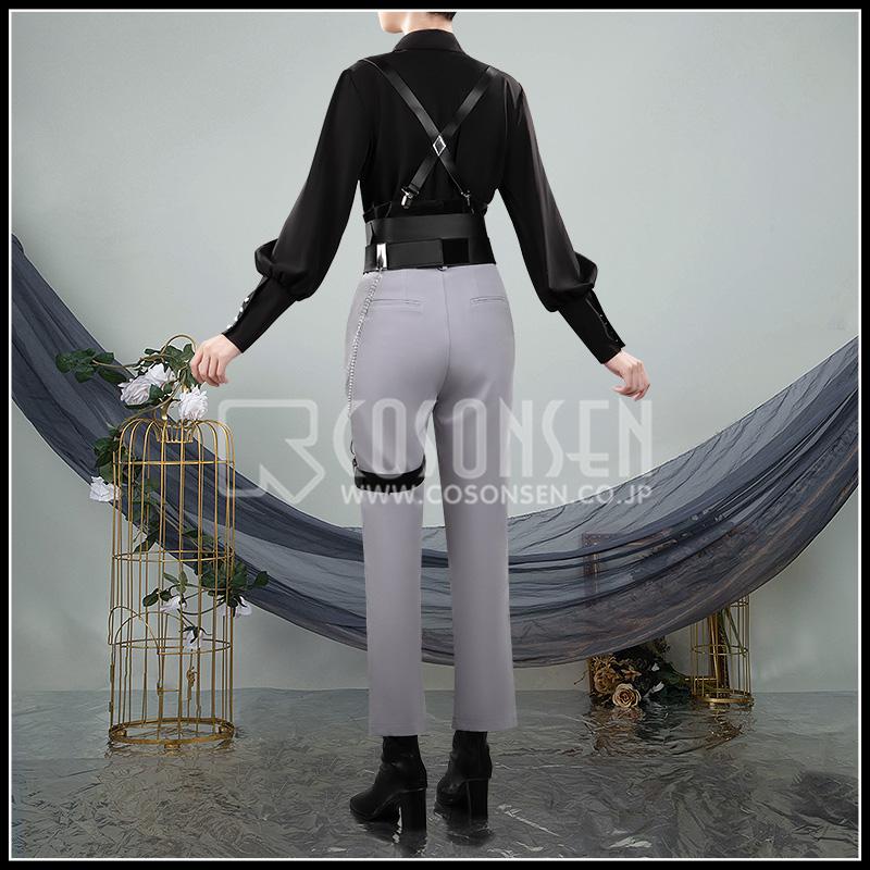 ポリウレタン混紡の生地で製作しています。適度なストレッチ性ありの素材を使い、体のラインに沿って自然にフィットしつつ、シャープなシルエットも維持できます。コートと同じのグレーをベースに、裾にブラックのスリットが入り、ウエスト周りにはベルトやチェーン、サスペンダー風のディティールが配置され、コーデ全体の華やぎ度をUPさせます。