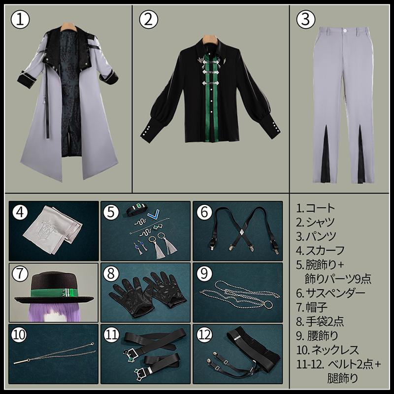 コート、シャツ、パンツ、飾り物(スカーフ、腕飾り、飾り物パーツ9点、サスペンダー、帽子、手袋2点、腰飾り、ネックレス、ベルト2点、腿飾り)