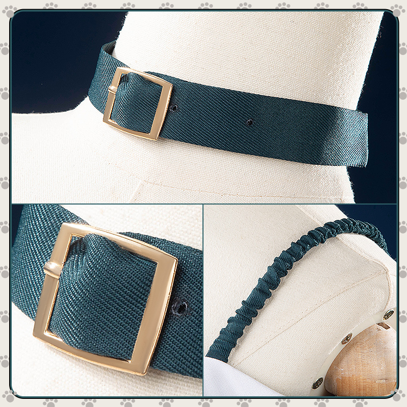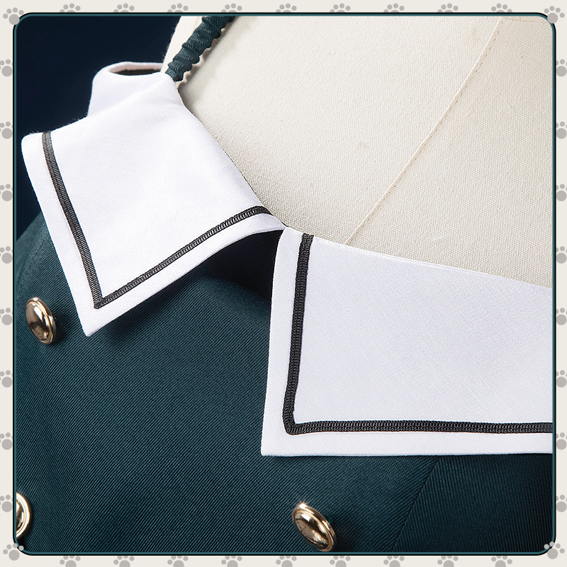 ポリエステルギャバで製作しています。セーラースタイルの金ボタンと白い襟がレトロな制服の雰囲気を醸し出し、オフショルダーデザインが軽やかさを際立たせます。落ち着いた色合いの中に少女らしい魅力が溶け込み、春夏にぴったりの一着です。