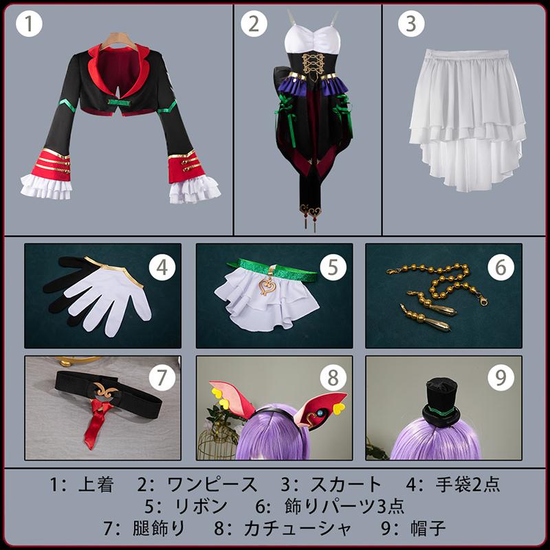 上着、ワンピース、スカート、手袋2点、飾り物(リボン、飾りパーツ2点、腰飾り、カチューシャ、帽子)
