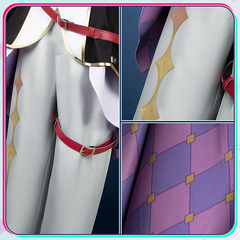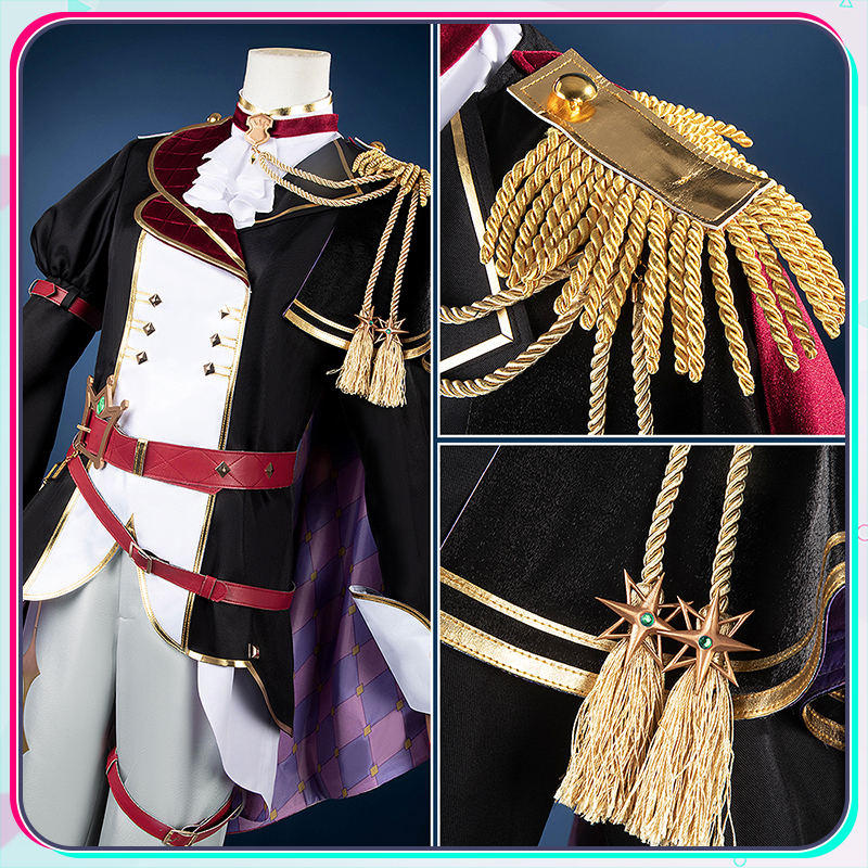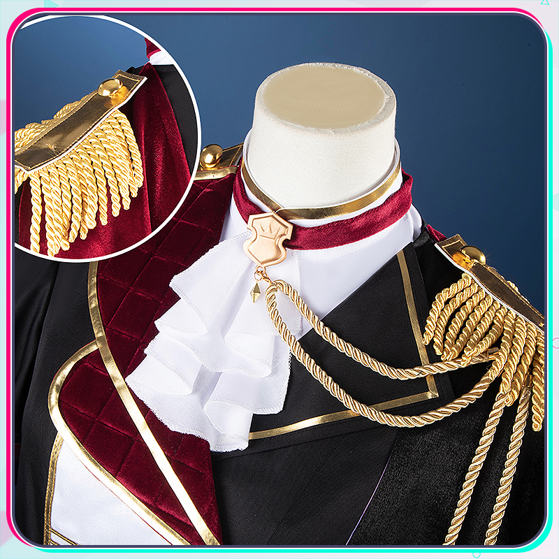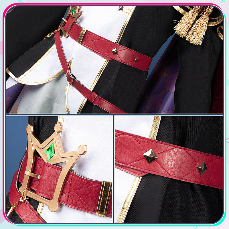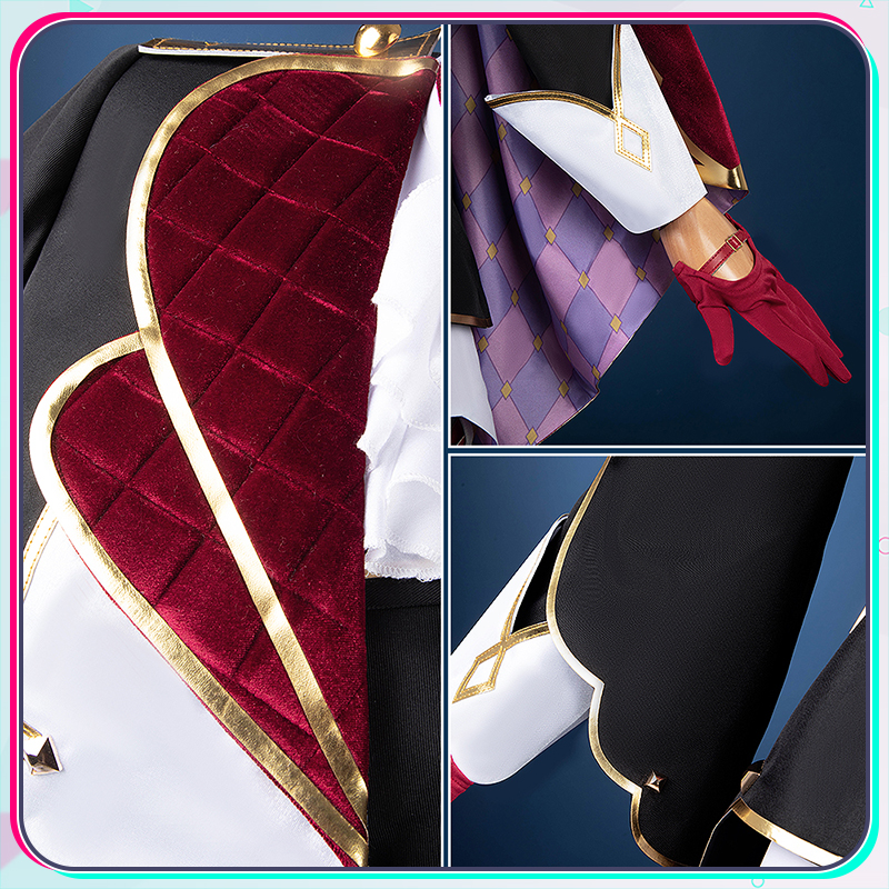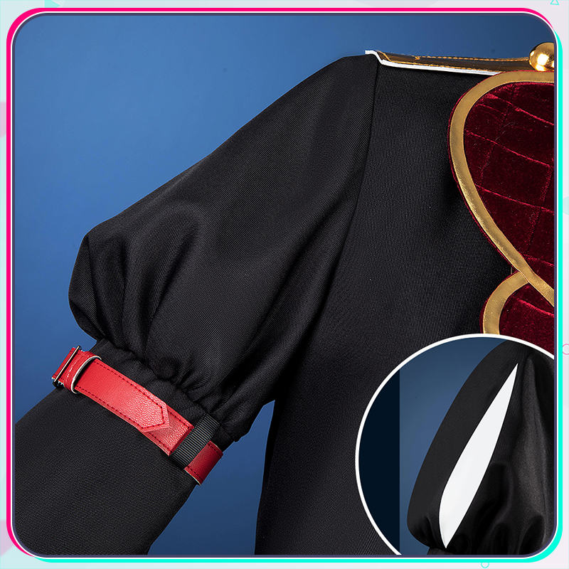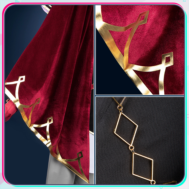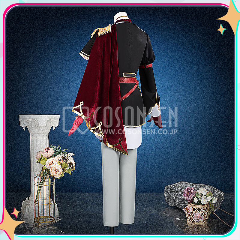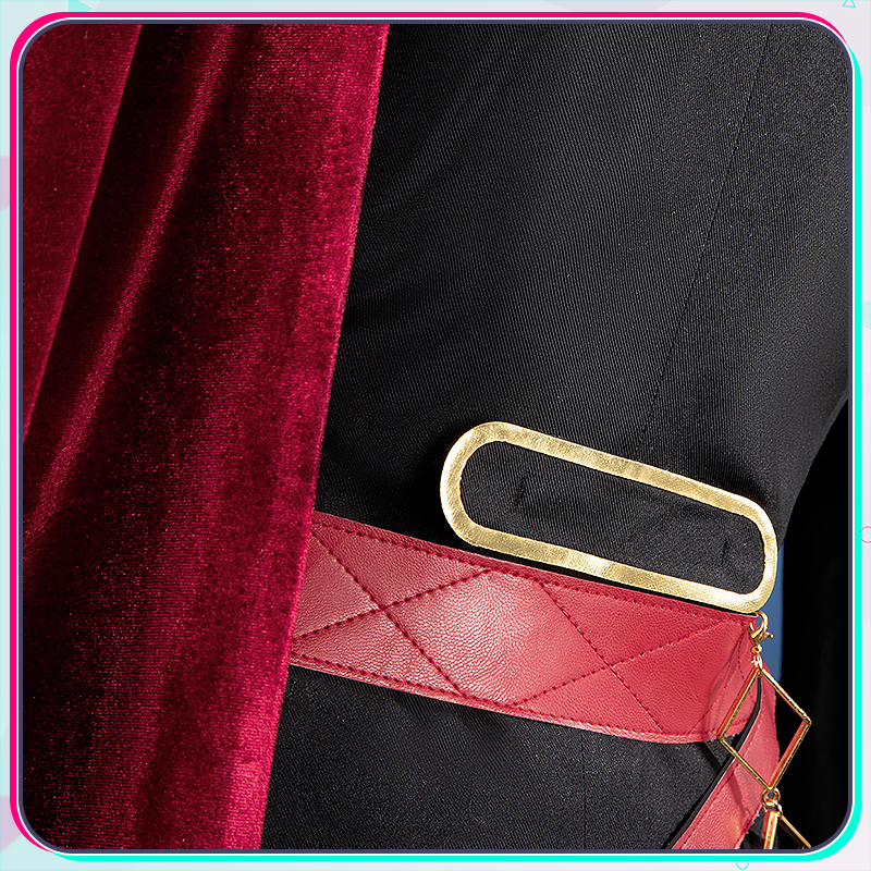 光沢布、ポリエステルギャバとベルベット生地で製作しています。黒を基調とする衣装に付属する赤いマントと立ち襟が鮮やかな赤で統一され、衣装全体に調和のとれた美しい一体感を創り出しています。