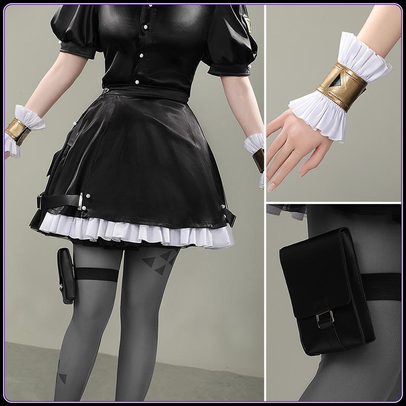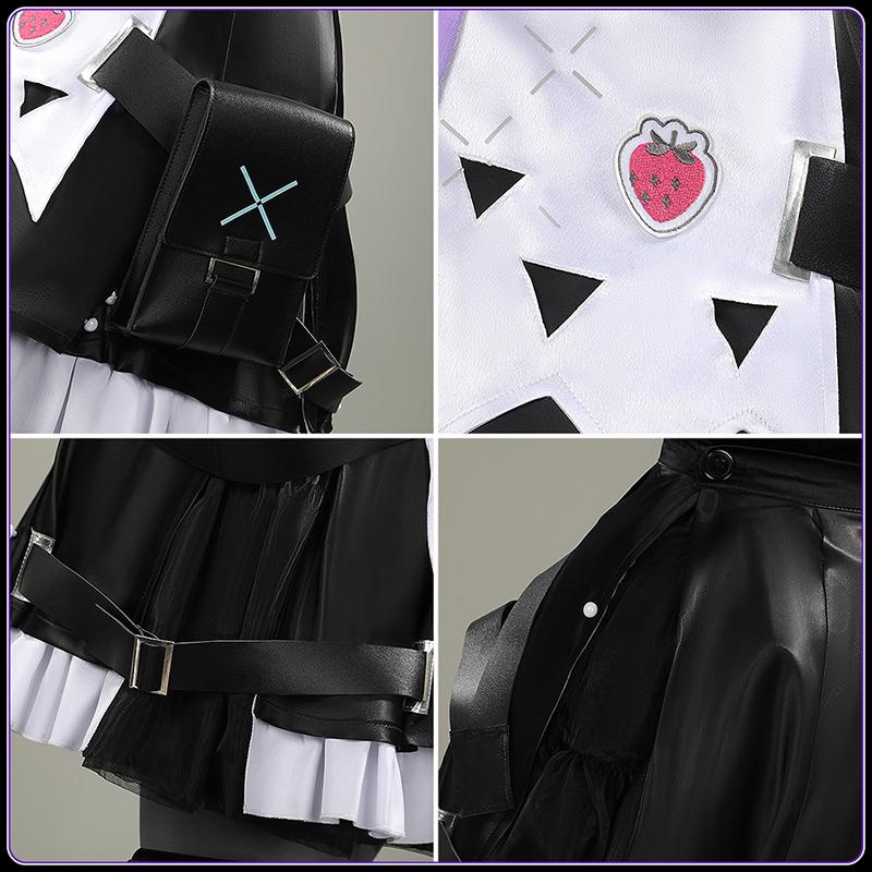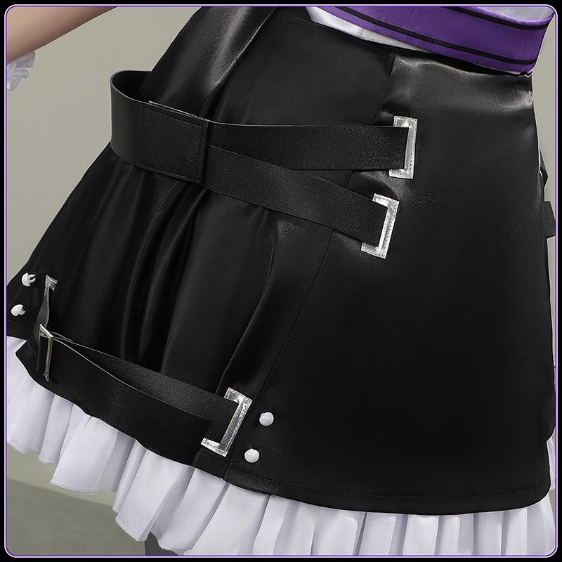 ポリエステル・サテンで製作しています。複数のブラックベルトがクロスし装着されており、裾の部分には白いフリルが付いており、可愛らしさとエッジの効いたデザインが見事に融合しています。