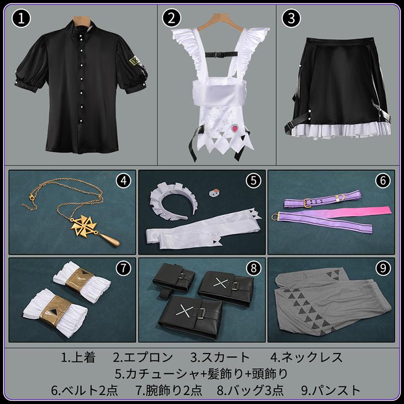 上着、エプロン、スカート、飾り物(ネックレス、カチューシャ、髪飾り、頭飾り、ベルト2点、腕飾り2点、バッグ3点、パンスト)