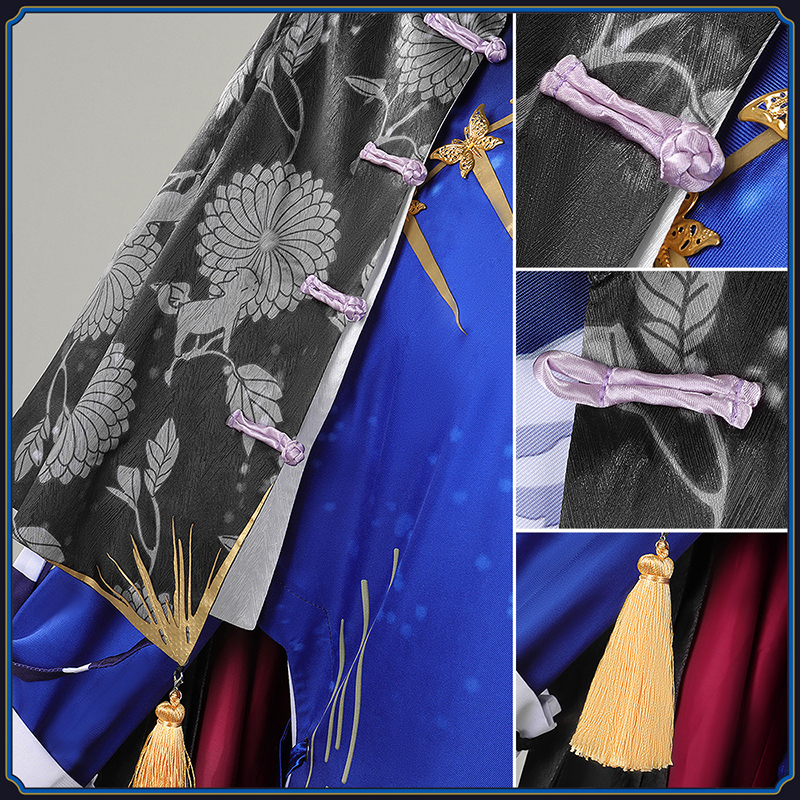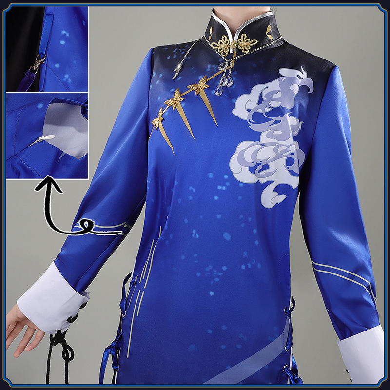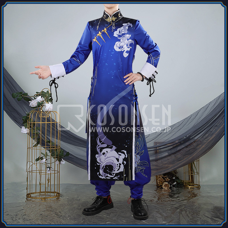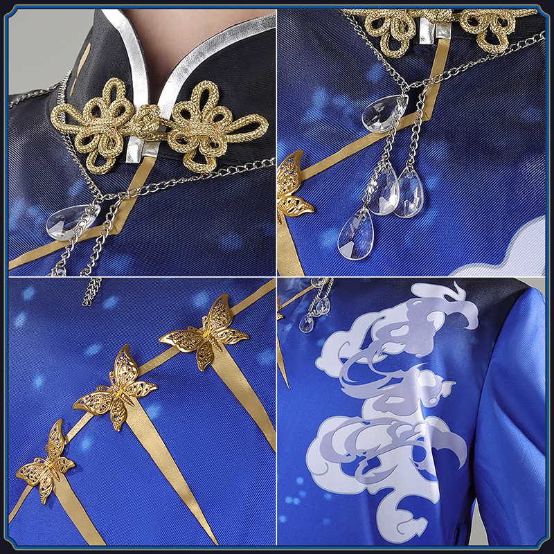 ポリエステルギャバで製作しています。ロングガウンの両側にスリット調節紐が付き、フロントに蝶模様のボタンが縫い付けています。雲模様の柄が綺麗にプリントされて、中華風たっぷりです。