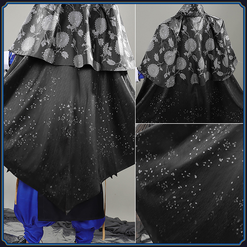ヘリンボーンで製作しています。レイヤードケープのデザインで、華麗な生地で作られて高級感満々です。原作に忠実な絵柄が綺麗にプリントされて再現度が高いです。