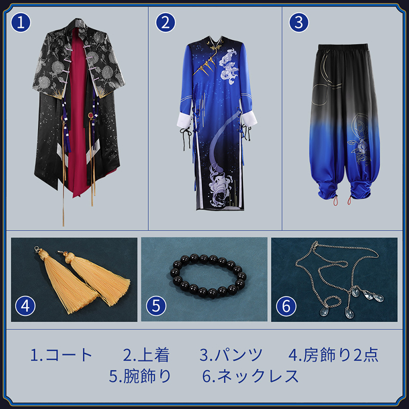 コート、上着、パンツ、手飾り物(房飾り2点、腕飾り、ネックレス)