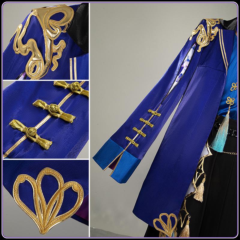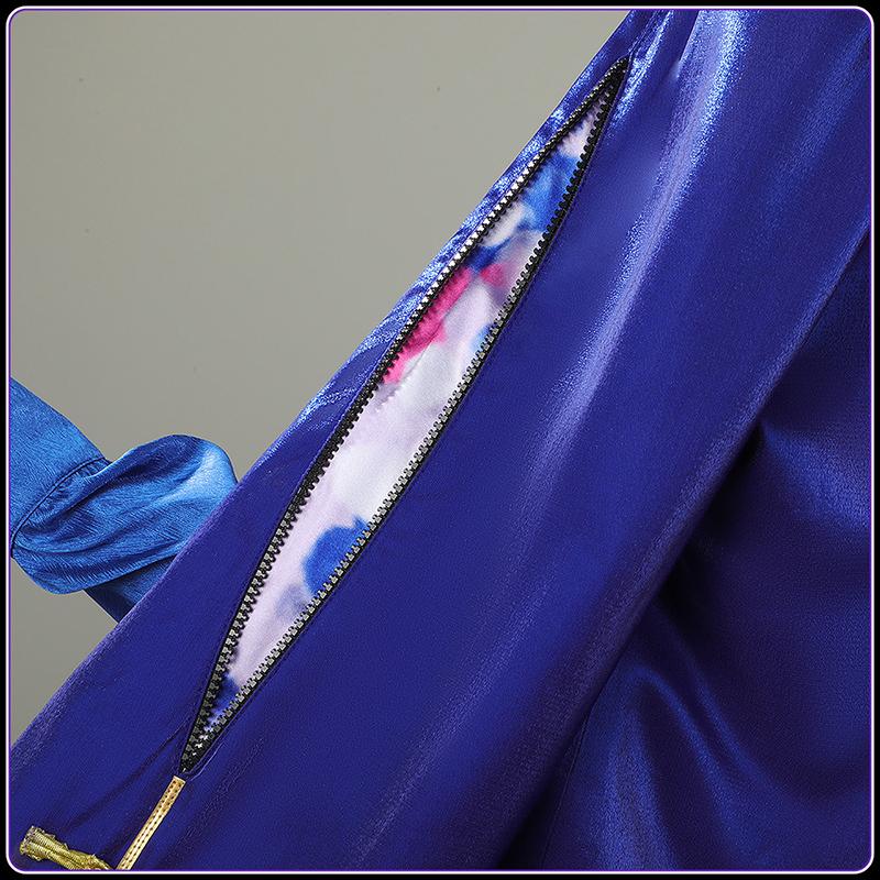 襟元には黒いラペルが配され、色のコントラストで高級感を増幅させています。前身頃や袖口には、伝統的なチョウカン風の金色ボタンが採用されます。袖にはジッパーが設けられており、開閉することでディテールの変化た着用感を調整できるため、機能と美の両立を実現しています。