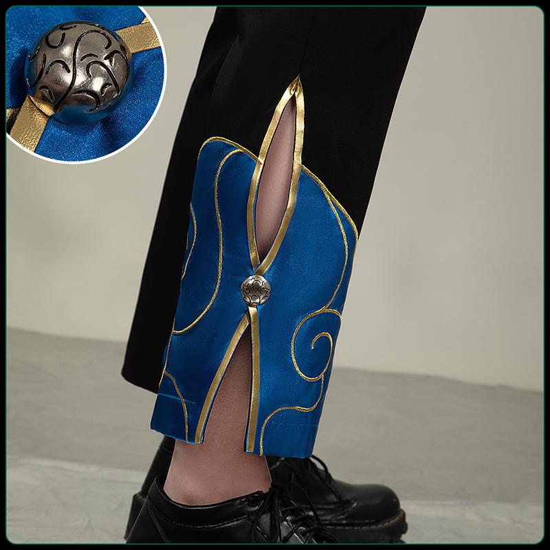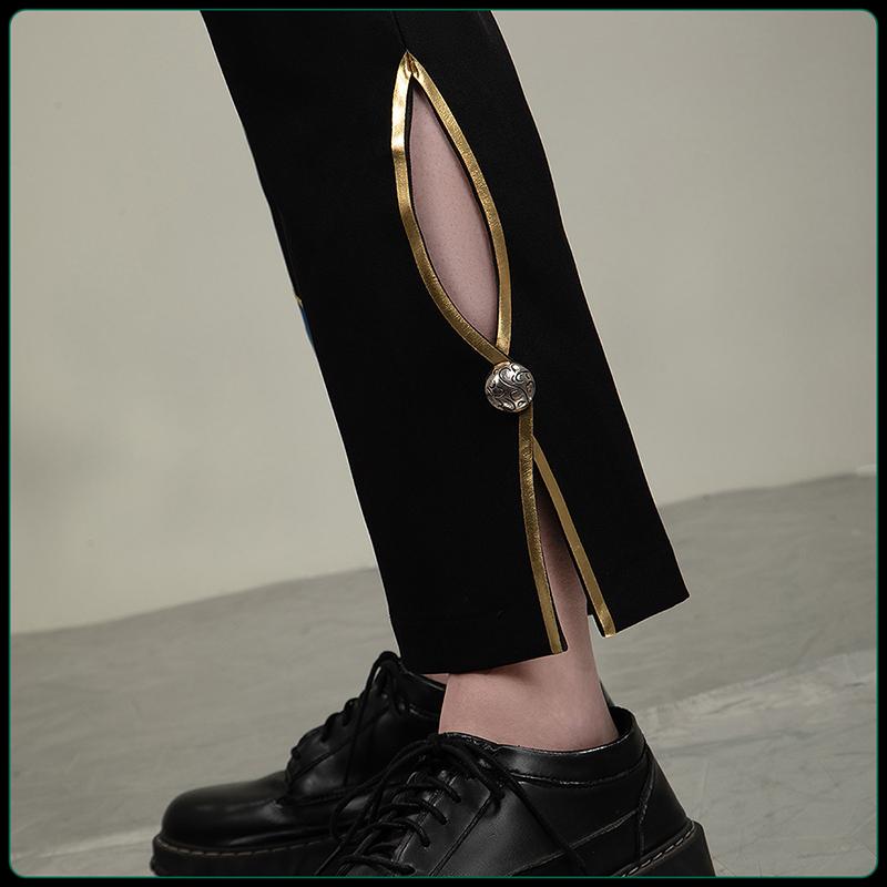 TRサージで製作しています。黒を基調としつつ裾部分に鮮やかな青いと金色の装飾が施され、デザイン性に富んでいます。裾にはスリットが設けられ、動きのある着用感と独特のスタイルを演出します。