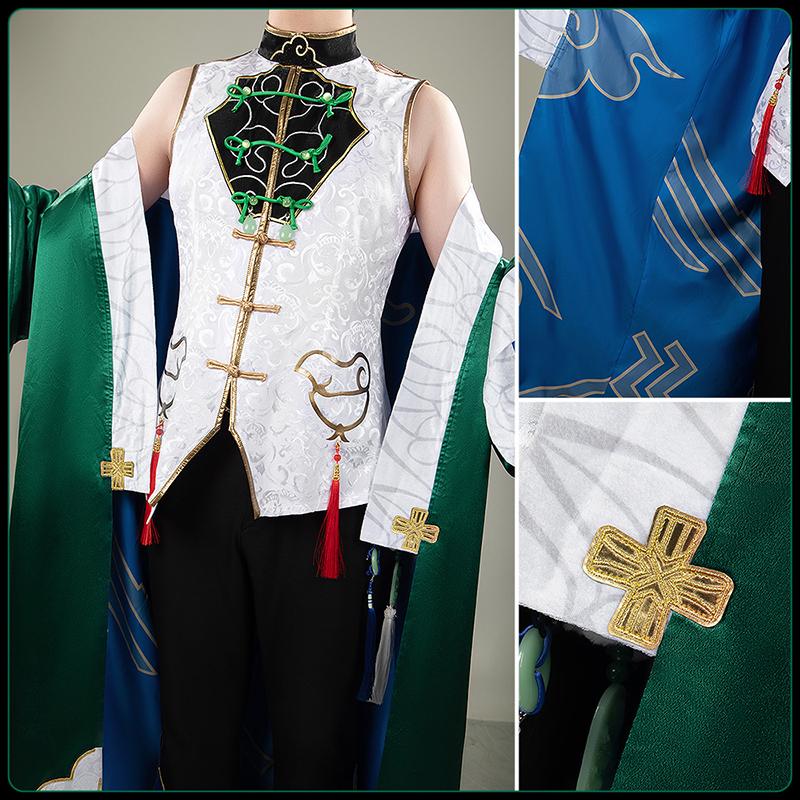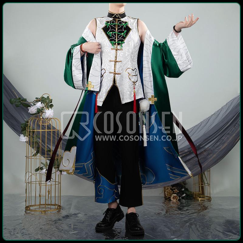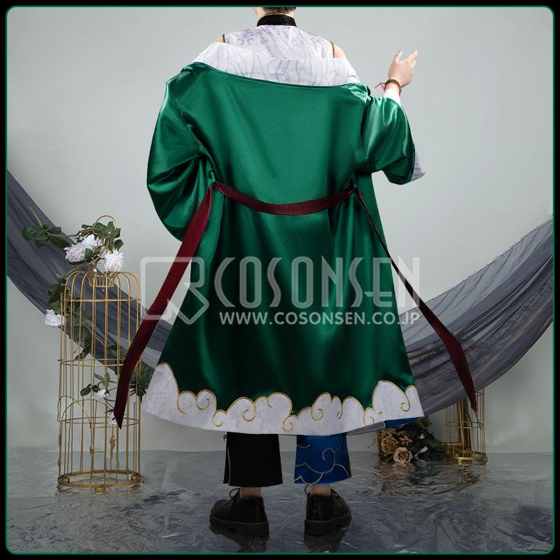 クリスタルサテンで製作しています。鮮やかかな緑色を基調とし、和風を感じさせるデザインが特徴的です。裾部分には白い曇模様の刺繍に金のラインが施されます。内部には青い曇柄の生地が配され、表裏で異なる趣を楽しめます。また、赤い装飾ベルトが付属しており、ウエストラインを強調したり、着用スタイルを変化させたりすることが可能です。
