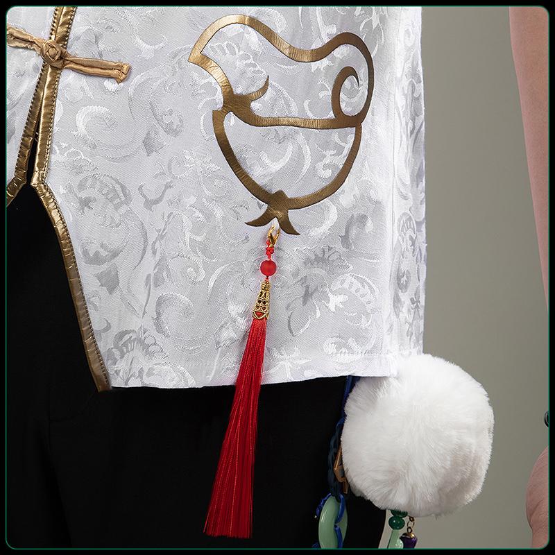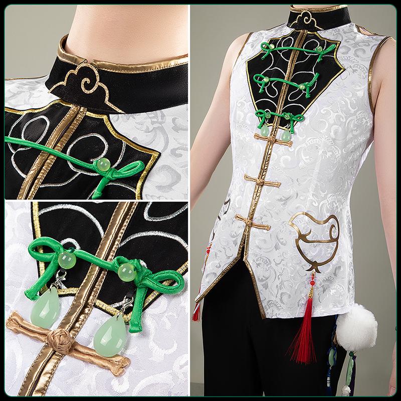 ジャガード生地で製作しています。白を基調としたデザインで、胸元には黒地に独特な緑のボタンが施され、華やかで個性的な印象を与えます。小鳥のような模様が配置され、伝統的な要素と現代的なファッション性を融合させています。