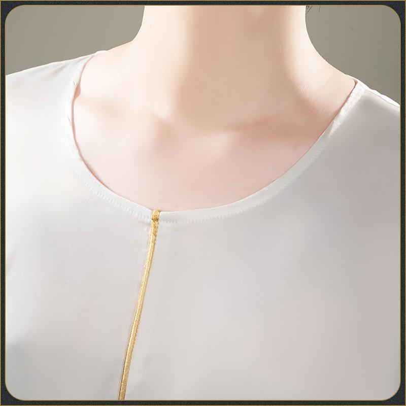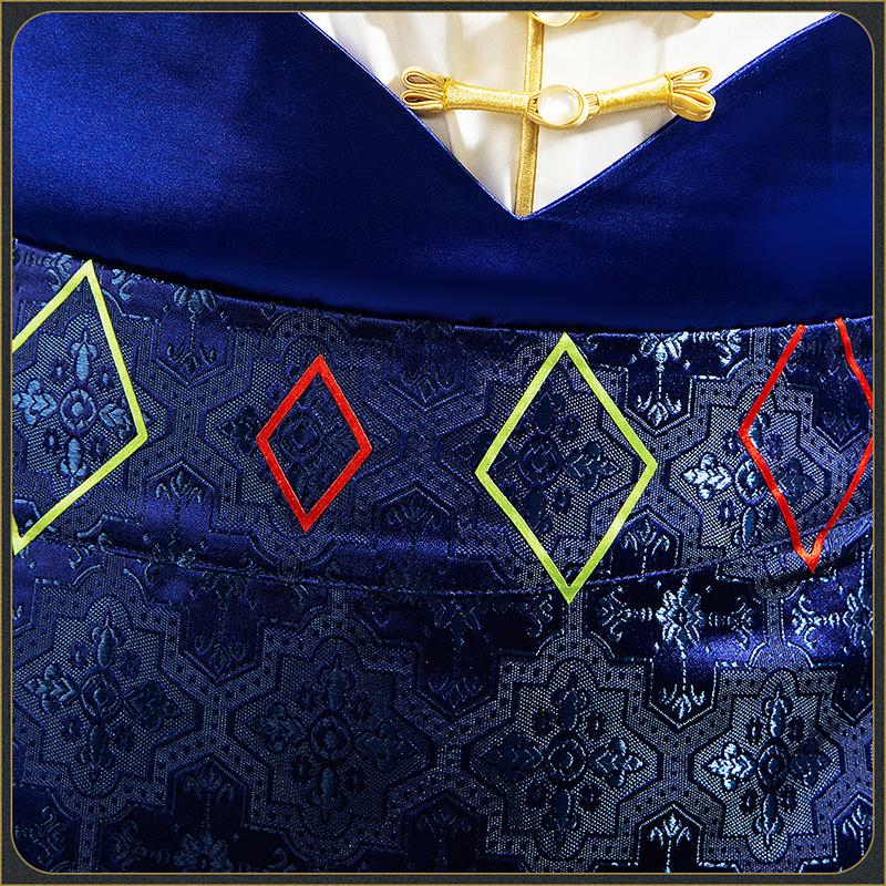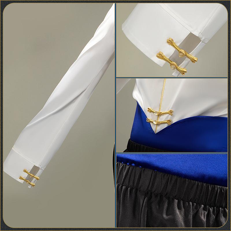 光沢サテンで製作しています。クリーンな白を基調とした丸襟デザインはシンプルかつ洗練されており、胸元には金色の縁取りと伝統的なチョウカンがアクセントとして施されます。袖は非常にボリュームのあるビッグフレアスリープで、その広がりのあるシルエットが華やかさと独特の存在感を与えています。また、袖口部分にも金色のディテールが施され、全体の統一感と精緻さを高めています。