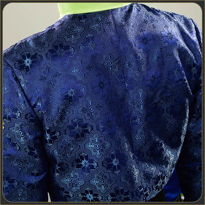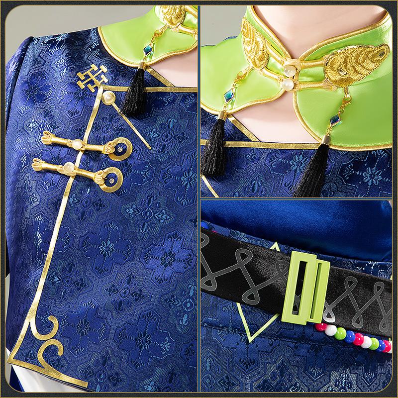 ジャガード生地で製作しています。中華風の立襟を採用し、襟元には鮮やかな緑色の布地がアクセントとして配され、全体の彩りを引き締めています。前身頃に金色の伝統的なチョウカンが施され、伝統美を感じさせつつ、装飾性を高めています。さらに、チョウカン周りや襟元には精緻な金の刺繍、縁取りが施され、繊細さと華やかさを加えています。