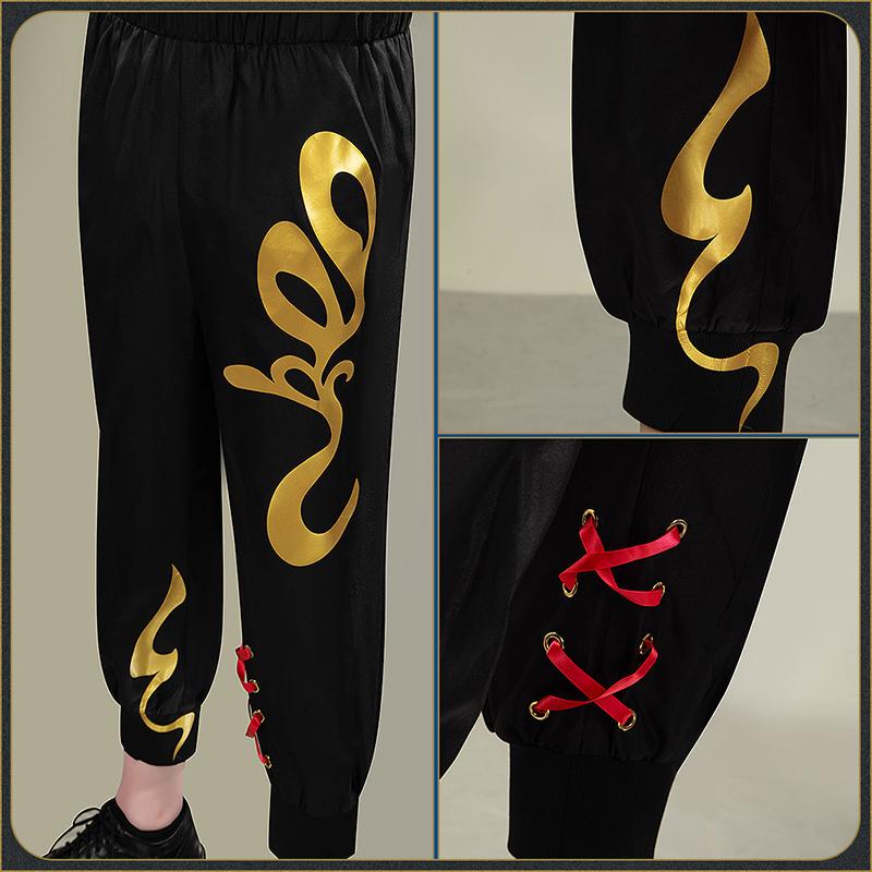 TRサージ生地で製作しています。脚側面から裾にかけて金色の光沢のあるアートワーク調なモチーフが配されています。また、裾部分には赤いサテンリボンによるクロスレースアップデザインが施されており、金属製のリングと組み合わさることで、可愛らしさと精緻な装飾性を加えています。腰部はゴム締めで、着脱簡単で快適性に優れています。