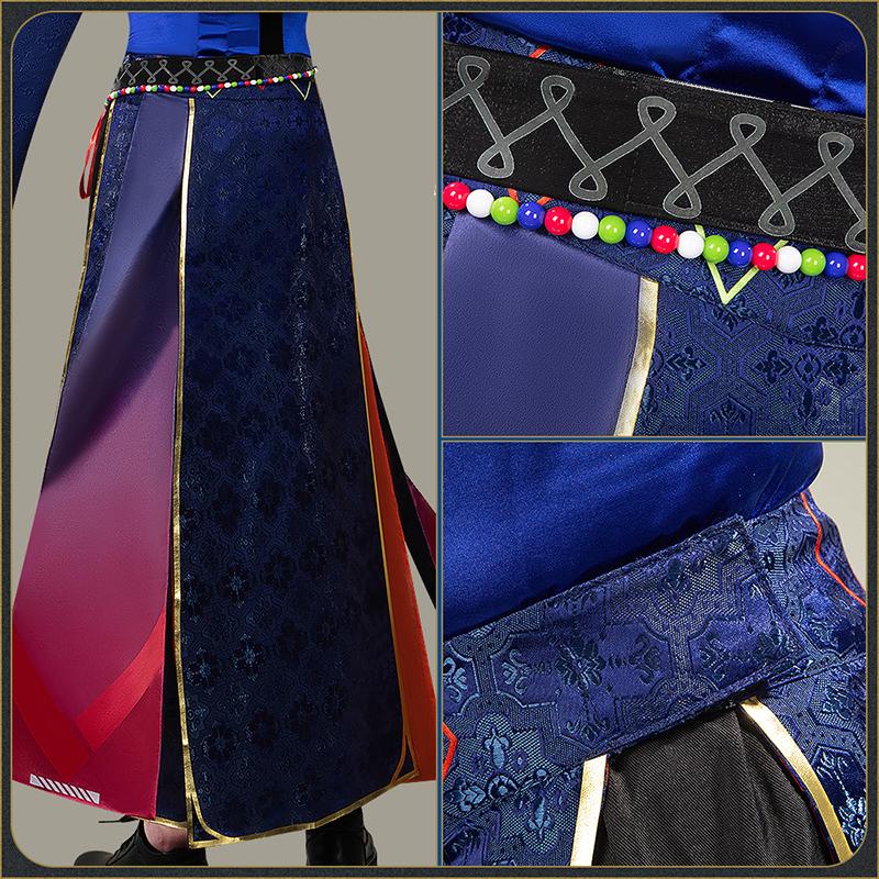 ジャガード生地で製作しています。全体としてはスリット付きのロングスカートのようなシルエットをしており、歩くたびに躍動感と華やかさをうみだしています。また、側面や裾の部分にも金色の装飾ラインが施されます。