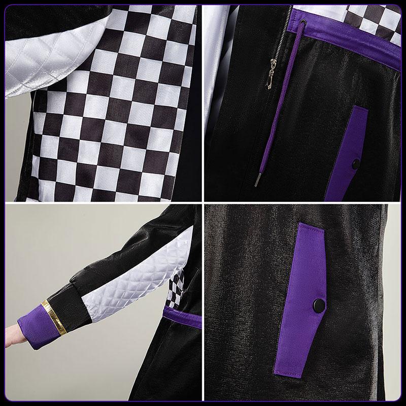 光沢布、光沢サテンで製作しています。肩部や袖の一部に白と黒のチェッカー柄を配し、パープルとゴールドのアクセントカラーが特徴的です。フード付きのデザインで、袖口やウエスト部分にはパープルの装飾帯とゴールドの縁取りが施され、ディテールにこだわりが見られます。