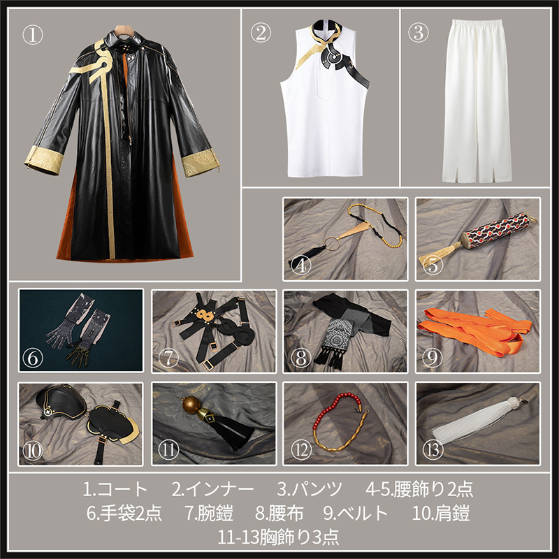 コート、インナー、パンツ、飾り物(胸飾り3点、腕鎧、手袋2点、肩鎧、腰飾り2点、腰布、ベルト)