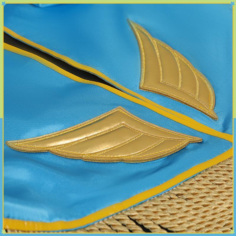 ポリエステルギャバで製作しています。水色と白のストライプを基調に、ボリューム感豊かなデザインが特徴的です。膨らみのあるシルエットに、イエローのパイピングとグリーンの金属フィティングが精緻に配され、裾のオレンジ色アクセントもキャラらしさを際立たせます。