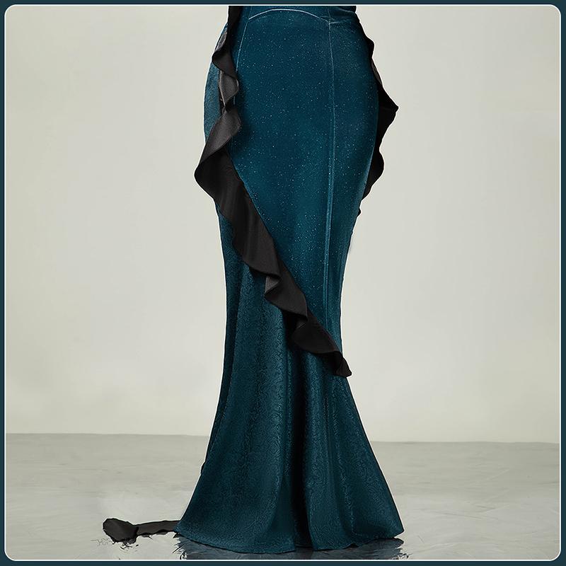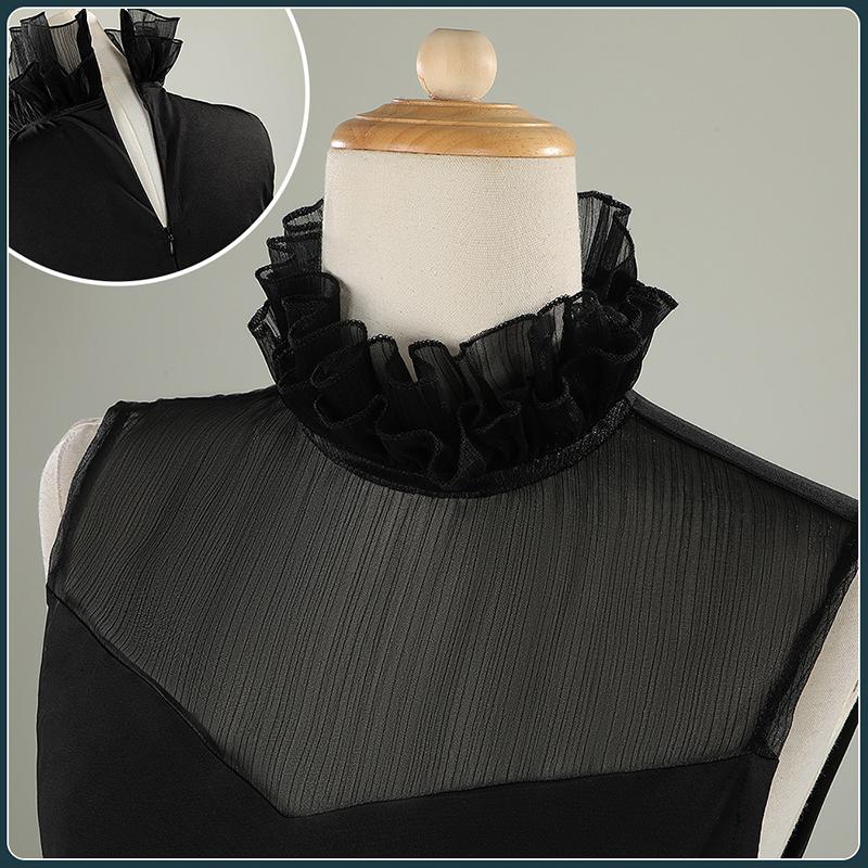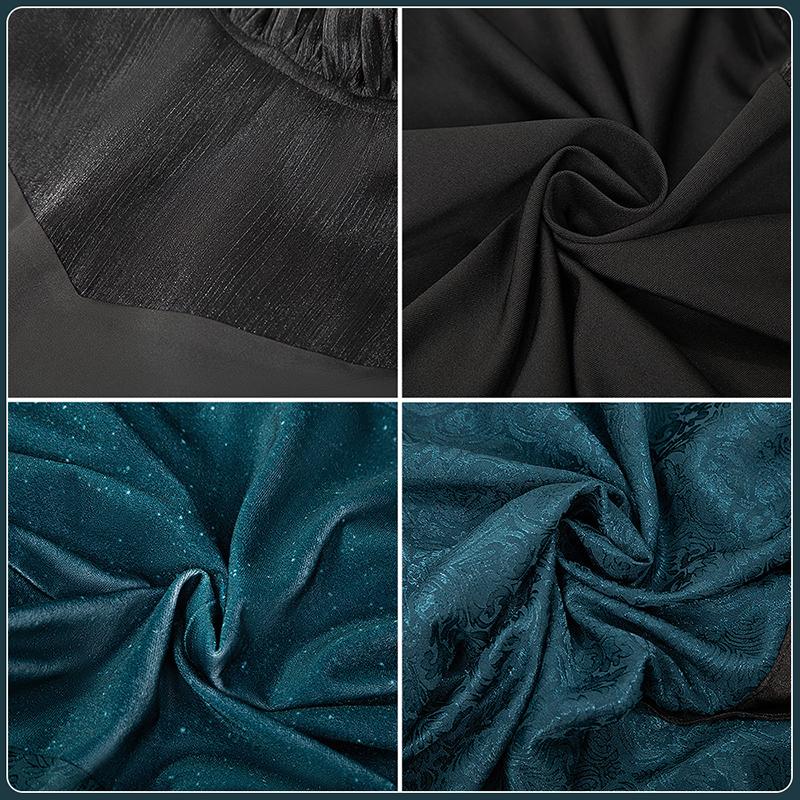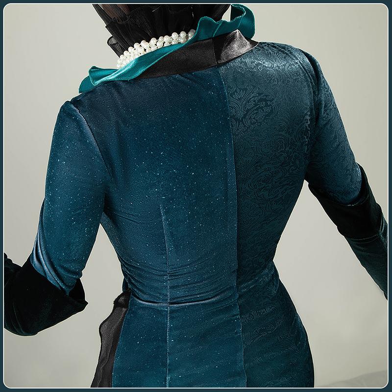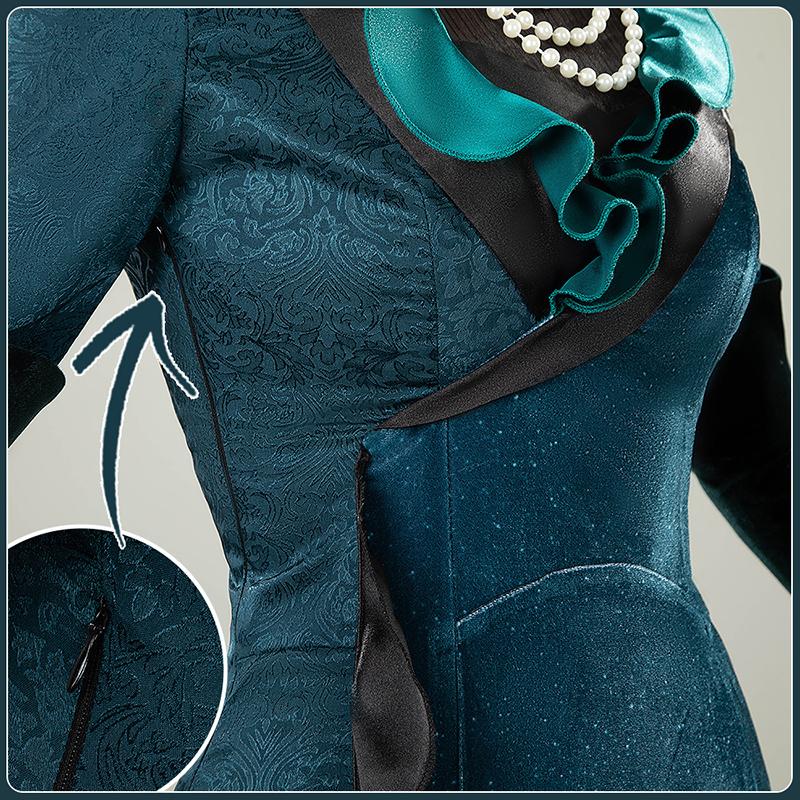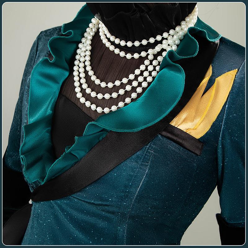 ジャカード生地とベルベットで製作しています。生地自体に施されたジャカード模様が服の質感を一層引き立てています。また、胸元のレース装飾は原画のデザインを忠実に再現しました。