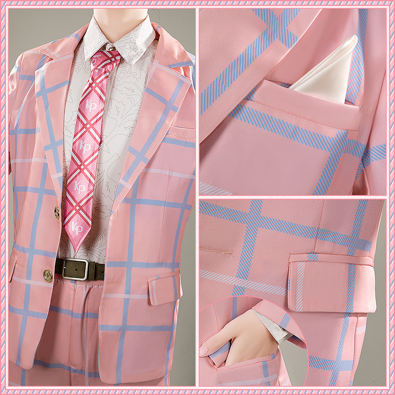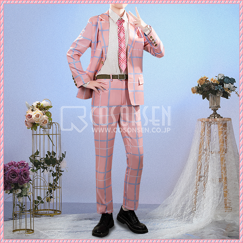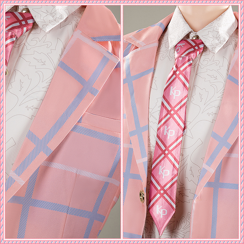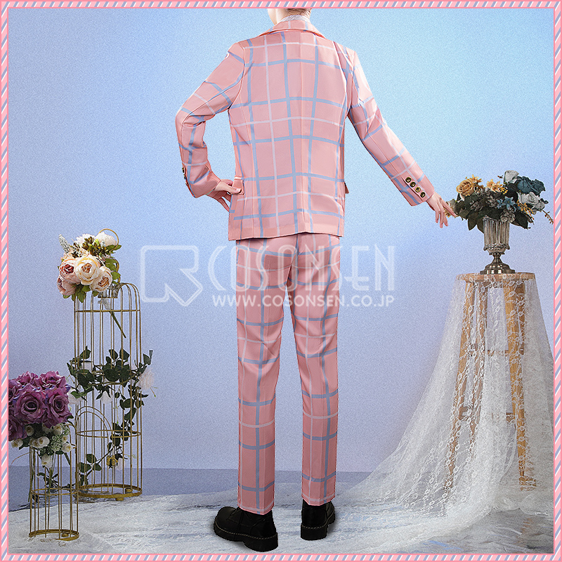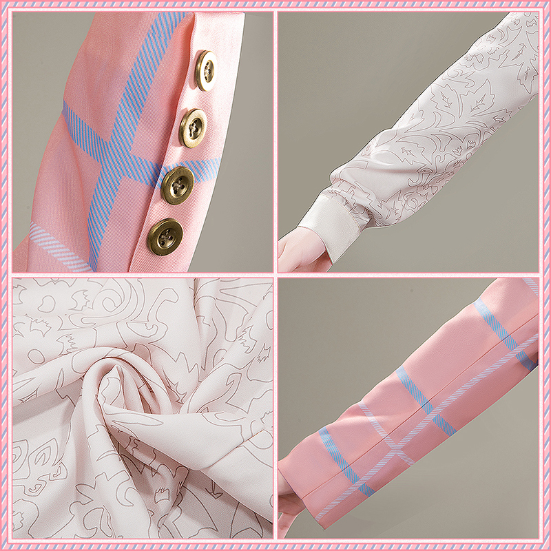 ポリエステルで製作しています。ピンクを基調としたチェック柄のテーラードジャケットで、シングルブレストの2つボタン仕様で、襟はノッチドラペル、袖口にはボタン付きのカフス、胸ポケットとフラップ付きの腰ポケットが付いています。