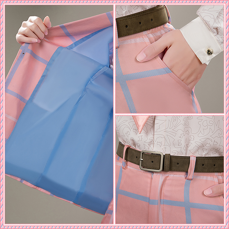 ポリエステルで製作しています。ピンクチェック柄ストレートズボンで、フロントはジッパーとボタン留め、サイドポケットとバックポケットが付いたクラシックなスラックススタイル。
