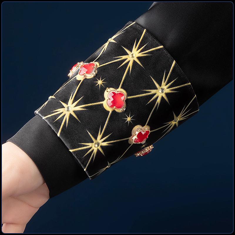 ダッチェスで製作しています。黒を基調としたデザインに、金色の刺繍が目を引くアクセントとなり、襟と袖に鏤められた煌びやかな宝石が個性的な魅力をさりげなく引き出している。