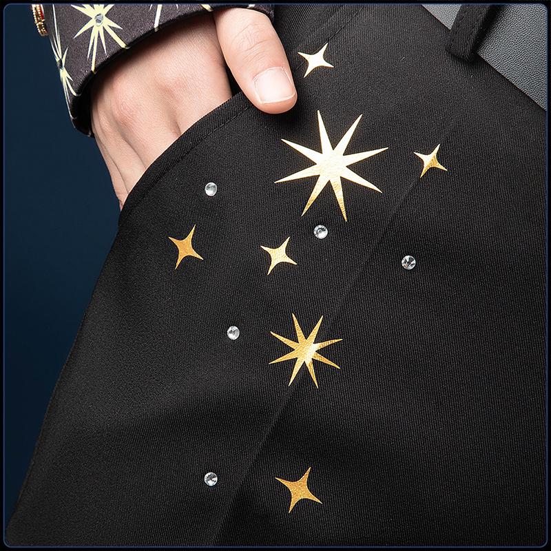 ポリエステルで製作しています。すっきりとした黒パンツに、小さな星形の模様が夜空の星屑のように散りばめられ、ほのかに輝く雰囲気を演出している。