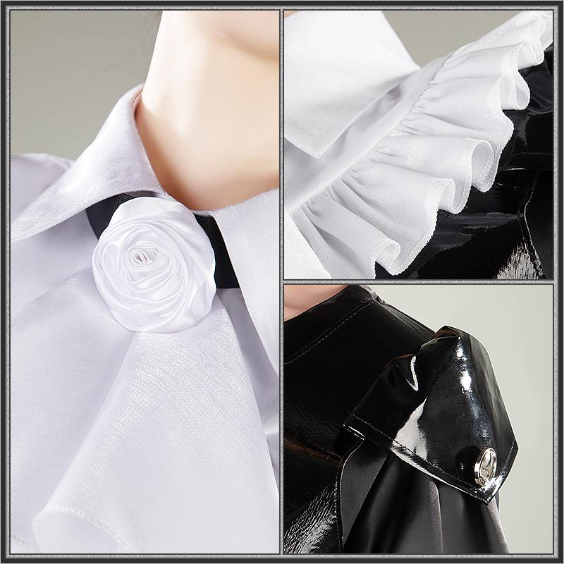 サテンで製作しています。高級感を感じるブラックと白の配色です。前に金属ボタンで飾られ、襟にバラのリボンが付き、華やかに見せています。